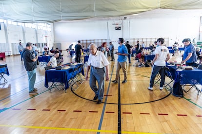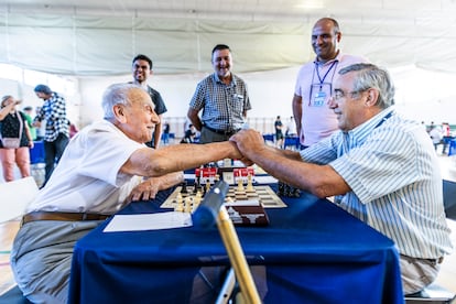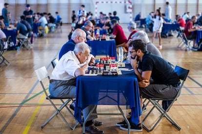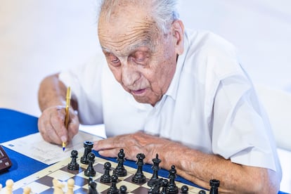 Este hombre de récord aparece por la puerta del torneo sin cámaras de televisión, ni influencers, ni admiradores. Va a batir su marca otro año más, pero nadie repara en él en esta tarde soleada de fin del verano. Se baja del autobús de la línea 8, diminuto y encorvado, y entra empujando su andador en el polideportivo de Moratalaz. Deja a un lado a la chavalería en la pista de atletismo y accede al pabellón del torneo, donde 75 tableros de ajedrez esperan listos sobre mesas con manteles azules. Lo reciben los colegas con palmaditas y motes cariñosos: “Manolín”, “Manolillo” o “maestro”. Él es Manuel Álvarez Escudero, el ajedrecista federado y activo de mayor edad del mundo. El mes que viene, el 12 de octubre, este madrileño cumplirá 104 años.