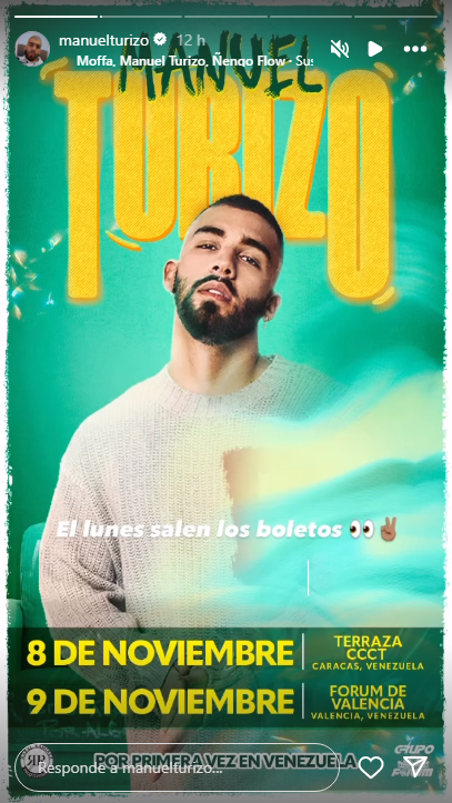 A través de sus historias de Instagram, el intérprete de Vagabundo dejó la información e indicó que para el 8 de noviembre estará cantante por primera vez en la Terraza del Centro Comercial Ciudad Tamanaco, para hacer lo mismo el 9 en el Forum de Valencia.