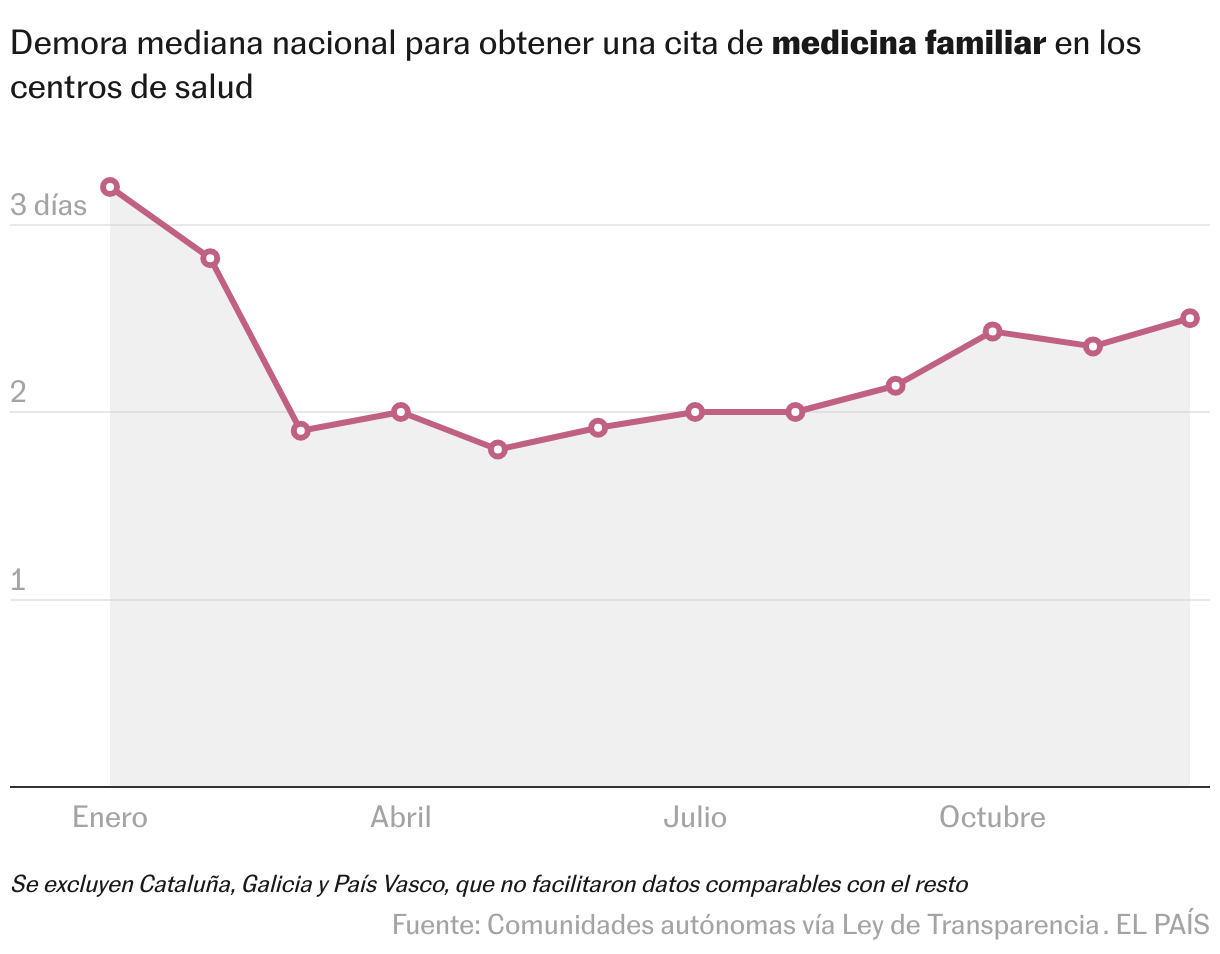 Los datos solicitados por EL PAÍS incluyen también demoras de pediatría y enfermería. Pero los retrasos aquí suelen ser menores: en enero, el peor mes de ambas, las citas para pediatría rozan los 1,5 días de mediana nacional, mientras que enfermería se queda en 0,9. Esta diferencia es lógica porque son un contexto distinto: a estos servicios se acude a menudo para vacunas, recetas o visitas agendadas, por ejemplo, dentro del programa de salud infantil.
