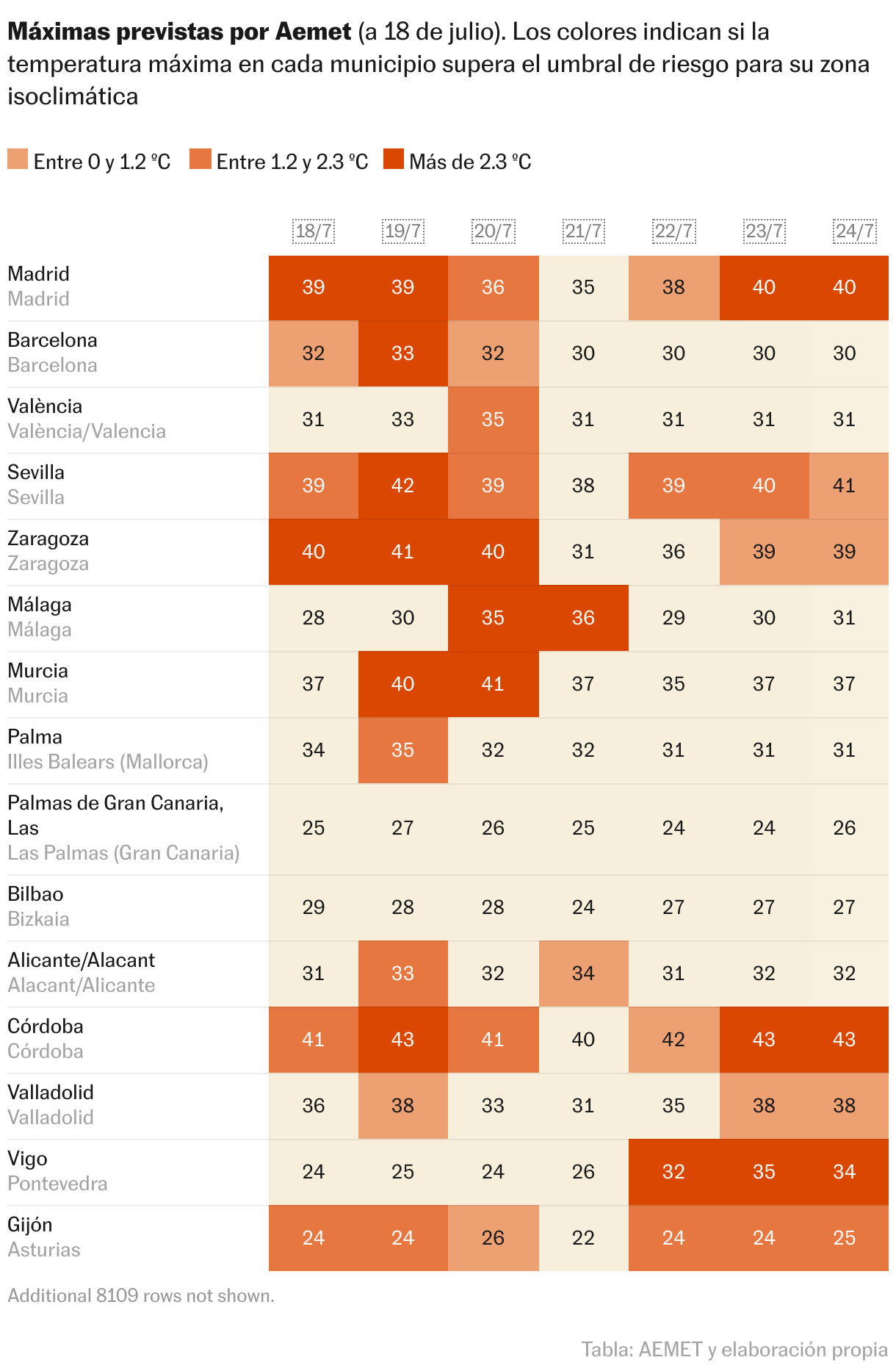 En la tabla puedes consultar la previsión de Aemet en tu municipio y si se prevé que se supere el umbral de riesgo del área de meteosalud en la que se ubica.