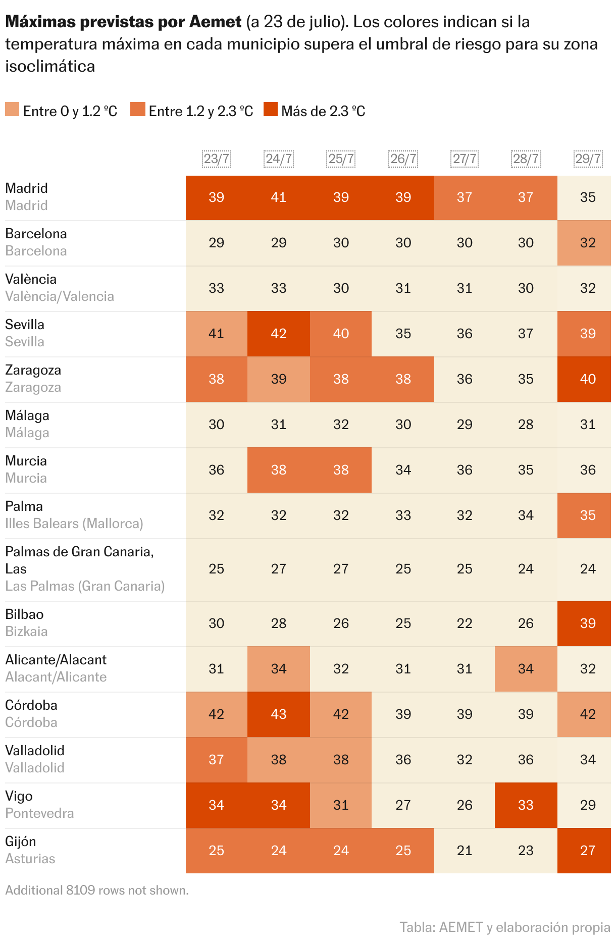 En la tabla puedes consultar la previsión de Aemet en tu municipio y si se prevé que se supere el umbral de riesgo del área de meteosalud en la que se ubica.
