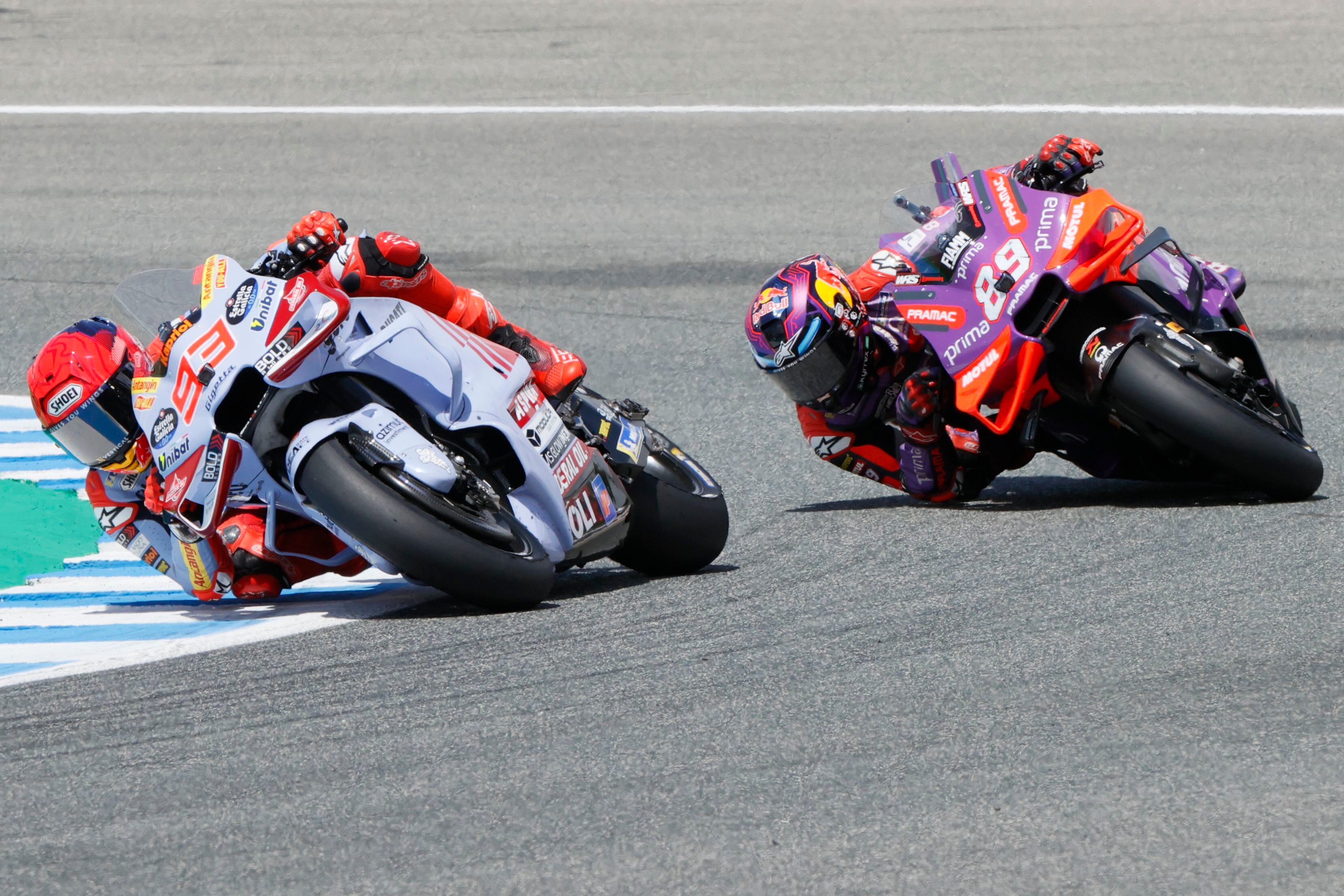 Marc Márquez llegó a Jerez satisfecho con su adaptación exprés a la Ducati, la mejor moto de la parrilla. Este sábado, con el asfalto mojado, sacó a relucir todo su talento para llevarse su primera pole position con la máquina italiana por delante de sus compañeros de marca, Marco Bezzecchi y Jorge Martín, con un tiempo de 1′46.773, ante la carrera de este domingo (14.00, Dazn y La Sexta). El ocho veces campeón del mundo celebró la primera plaza por todo lo alto con la afición, haciendo aspavientos para provocar el rugido de las gradas. Luego, sin embargo, se mostró más comedido sobre sus posibilidades en las carreras, si bien fue capaz de tomar la delantera hasta que una caída en la novena vuelta de la sprint evitó su primera victoria y le entregó el triunfo al líder del campeonato del mundo.
