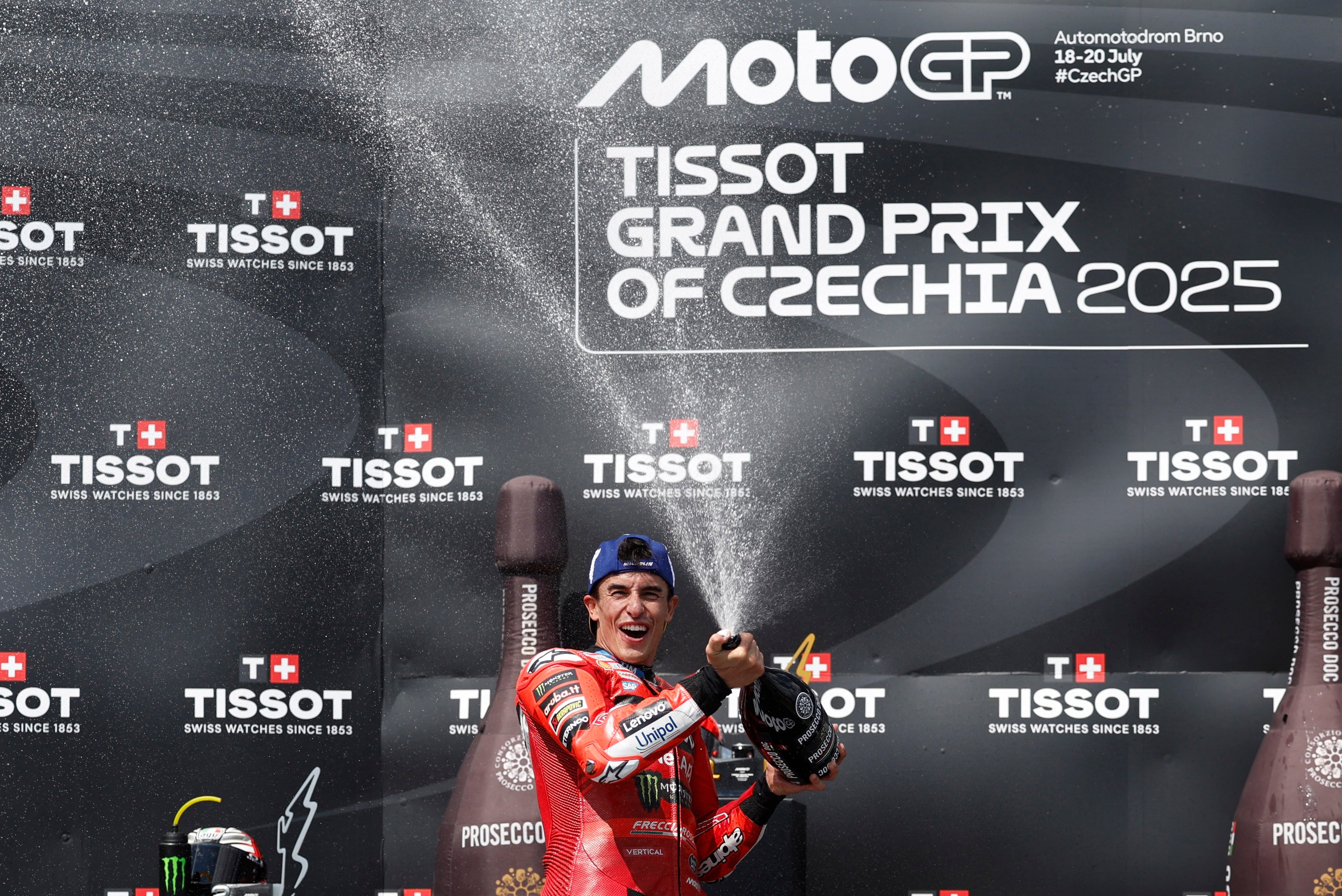 Marc Márquez avanza imparable e imperturbable hacia su novena corona en el Mundial de motociclismo justo cuando se cumplen cinco años de su demoledor accidente en el GP de España de 2020 en Jerez. Olvidado ya por fin aquel calvario físico y deportivo de cuatro años, el piloto de Ducati ha cogido un ritmo huracanado en su temporada de estreno con la moto más dominante de la parrilla. En el GP de la República Checa, el español volvió a mostrarse muy superior al resto de contrincantes y completó su quinto pleno de victorias consecutivo para irse de vacaciones con un margen de tres grandes premios al frente de la tabla. Su hermano Álex Márquez, que tuvo un fin de semana de perros, se cayó en los primeros compases de la prueba y no puntuó en Brno, un resultado que sitúa al líder del certamen a 120 puntos del resto cuando se reparten 37 cada fin de semana.