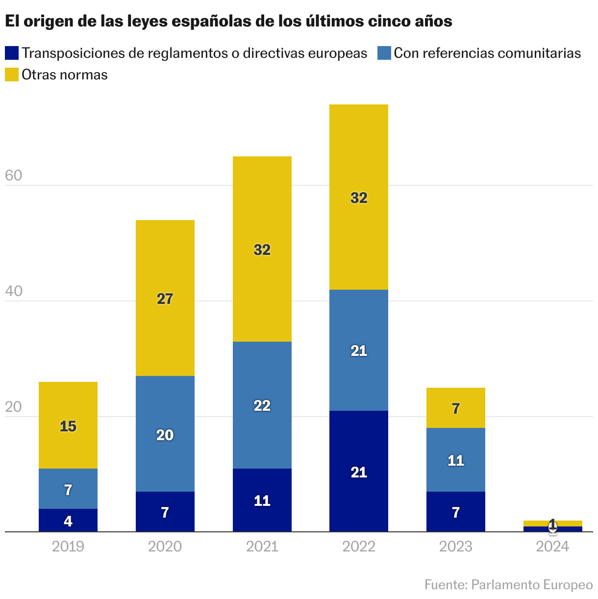 En 2023, el 72% de las leyes aprobadas en España tuvieron origen europeo. De las 25 que salieron adelante, siete respondieron a la aplicación de reglamentos comunitarios o al mandato de transposición al ordenamiento jurídico español de directivas europeas. La ley que regula la protección de las personas que informan sobre infracciones normativas y de lucha contra la corrupción es un ejemplo de transposición de una directiva europea de 2019. Otra de las leyes con clara influencia continental, cuyo texto legal alude a dos resoluciones del Parlamento Europeo, es la conocida como de bienestar animal, con la que se fomenta el uso responsable de mascotas y se castigan situaciones de maltrato.