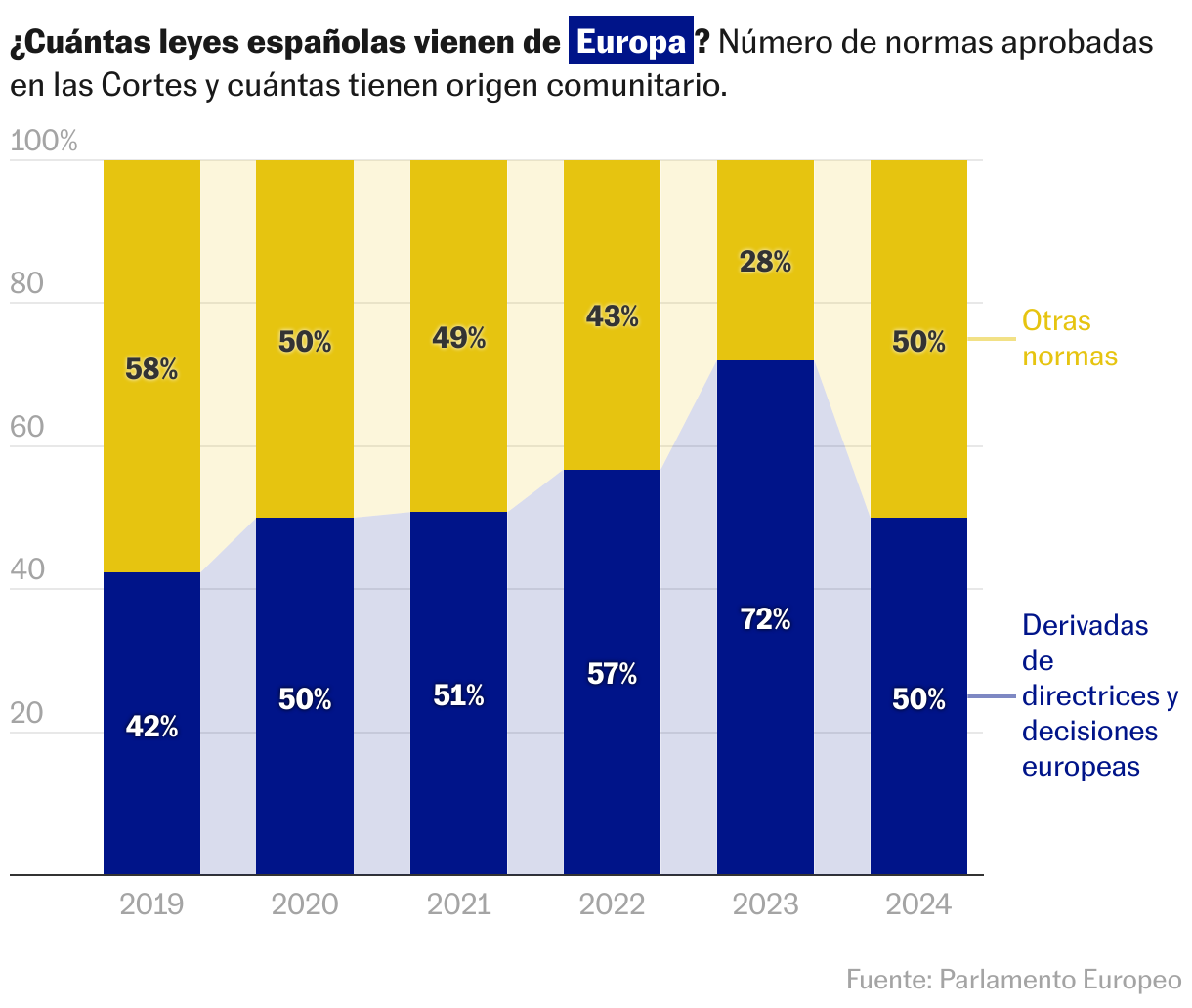 Desde hace un año, los ciudadanos españoles que deciden inscribirse como parejas de hecho cuentan con los mismos días de vacaciones que si se hubiesen unido en matrimonio. También existe un permiso retribuido de cinco días al año por cuidados de familiares o convivientes enfermos. Estos derechos han llegado a la legislación española impulsados desde Europa, como el 53% de las leyes que se han aprobado en las Cortes durante la última legislatura del Parlamento Europeo (2019-2024). De las 246 normas que han salido adelante en el Congreso y el Senado durante ese periodo, 51 aplican reglamentos europeos o transponen directivas y otras 81 contienen referencias a recomendaciones, programas o iniciativas comunitarias.
