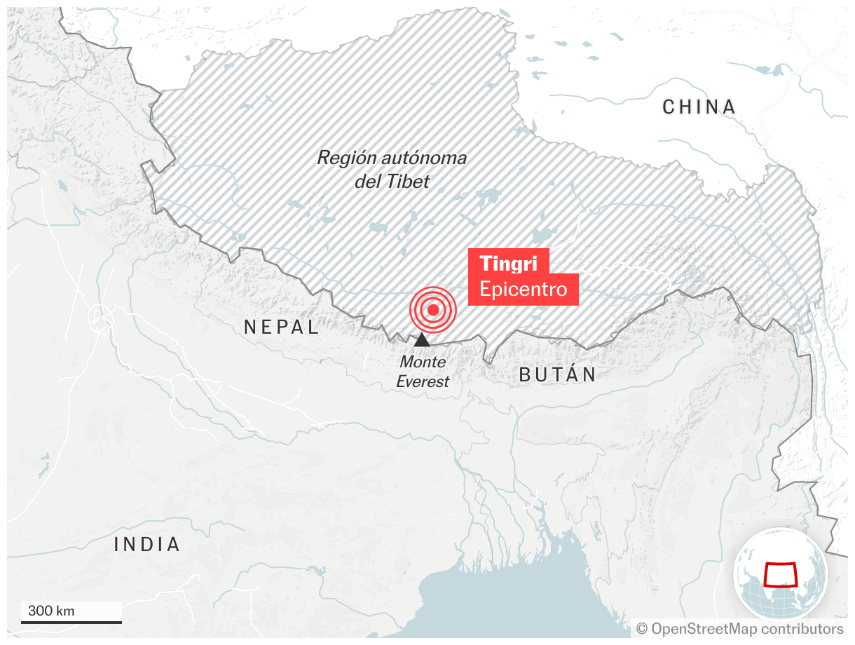 El terremoto se ha producido a las 9.05, hora local (2.05 en la España peninsular) y el epicentro se ha situado a una profundidad de 10 kilómetros en Tingri, un condado rural chino conocido por ser la entrada norte a la zona del Everest, según los datos facilitados por el Centro de Redes Sismológicas de China. El Servicio Geológico de EE UU asegura que el temblor ha alcanzado una magnitud de 7,1.