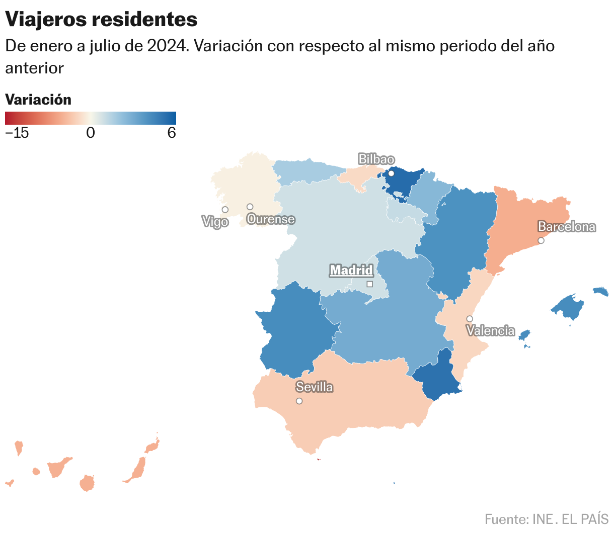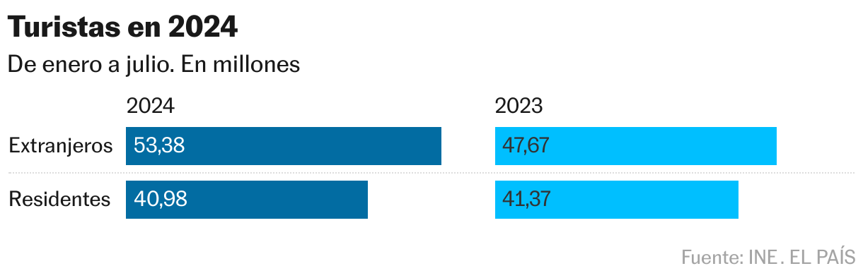 “Los españoles se lanzaron a viajar como si no hubiera un mañana después de la pandemia, y ahora hay una vuelta a la normalidad”, contextualiza Xavier Canalís, del medio especializado en turismo Hosteltur. El Instituto Nacional de Estadística (INE) confirma la ralentización. Entre enero y julio, el número de viajeros residentes en España retrocedió un 0,9%, la primera caída desde 2020. Cataluña, Canarias y Andalucía, mecas del descanso vacacional, registraron los mayores retrocesos.