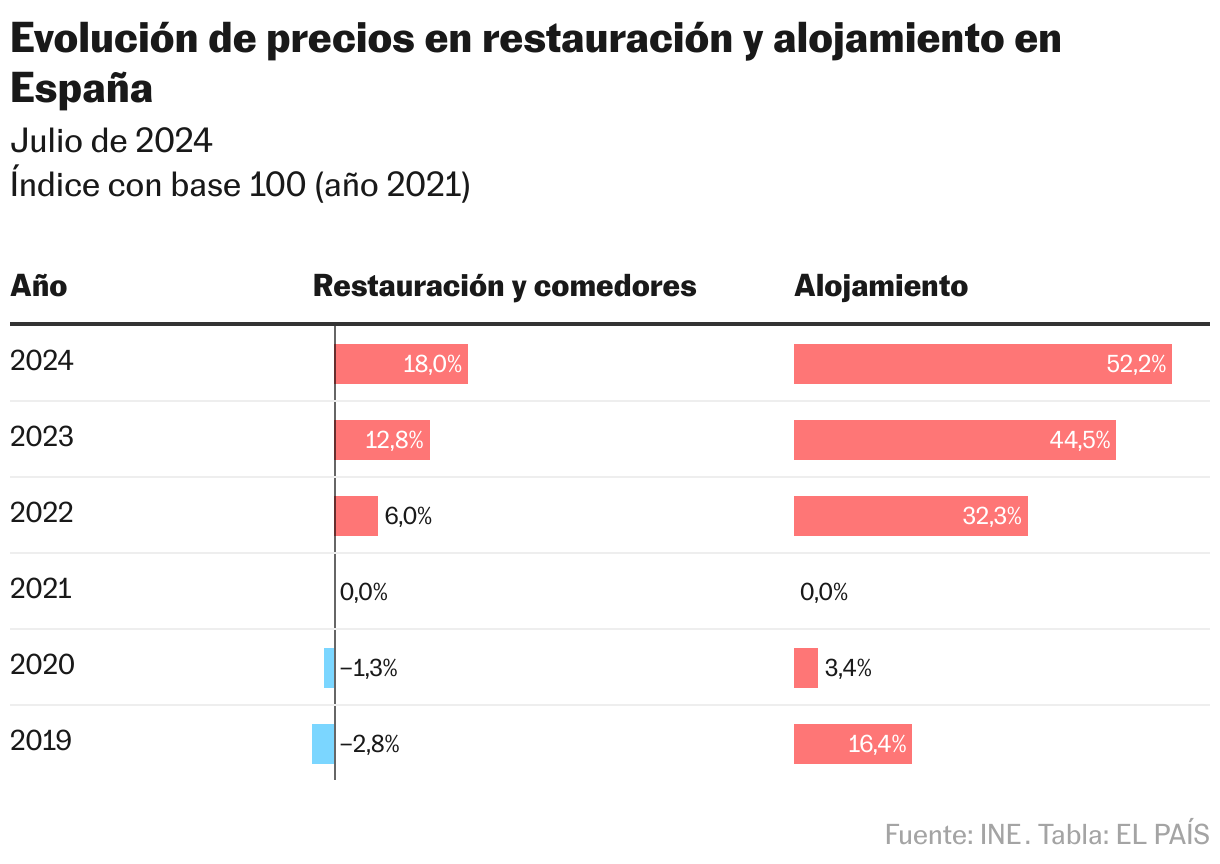 El país se ha despedido de lo peor de la crisis inflacionaria, pero en estos dos años el sector turístico ha incrementado con fuerza sus precios, aprovechando una época de vacaciones vertiginosas en las que la población se ha vengado de las excursiones que se perdió durante la pandemia. El índice de precios al consumo, cuya base 100 toma como referencia lo que valían los productos en 2021, muestra que en julio -último mes con datos disponibles- los vuelos nacionales superaron los 118 puntos, lo que significa que fueron un 18% más caros que hace tres años. Los paquetes turísticos nacionales han repuntado un 72%, los hoteles un 66%, y los restaurantes un 17%.