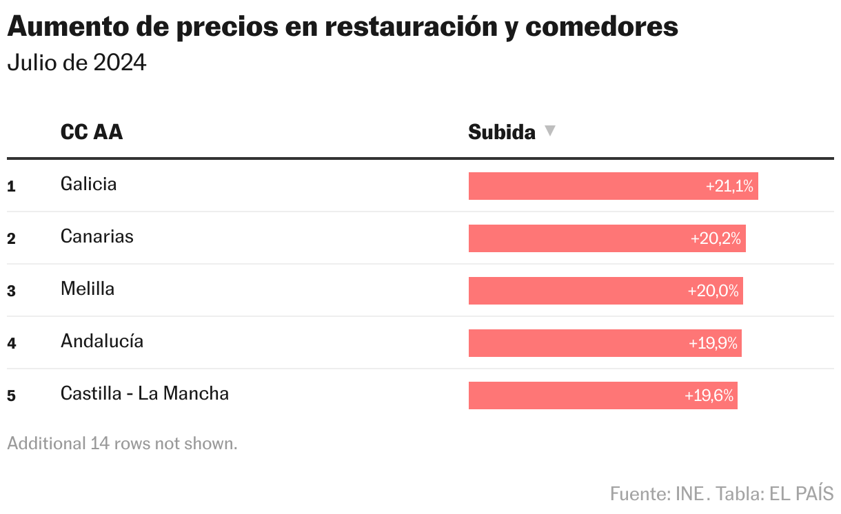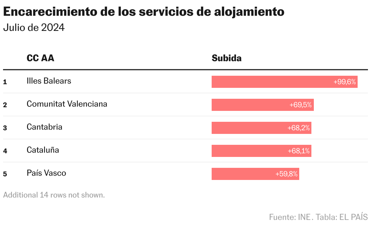 Si se mira la evolución de los precios entre comunidades, las cifras se vuelven incluso más escandalosas. En Baleares los servicios de alojamiento han repuntado en pleno verano un 100% respecto a 2021, en la Comunidad Valenciana lo han hecho casi un 70%, y en Cantabria y Cataluña un 68%. Los restaurantes, por su parte, se han encarecido con fuerza en Galicia, Canarias y Andalucía. Todos destinos populares entre los turistas.