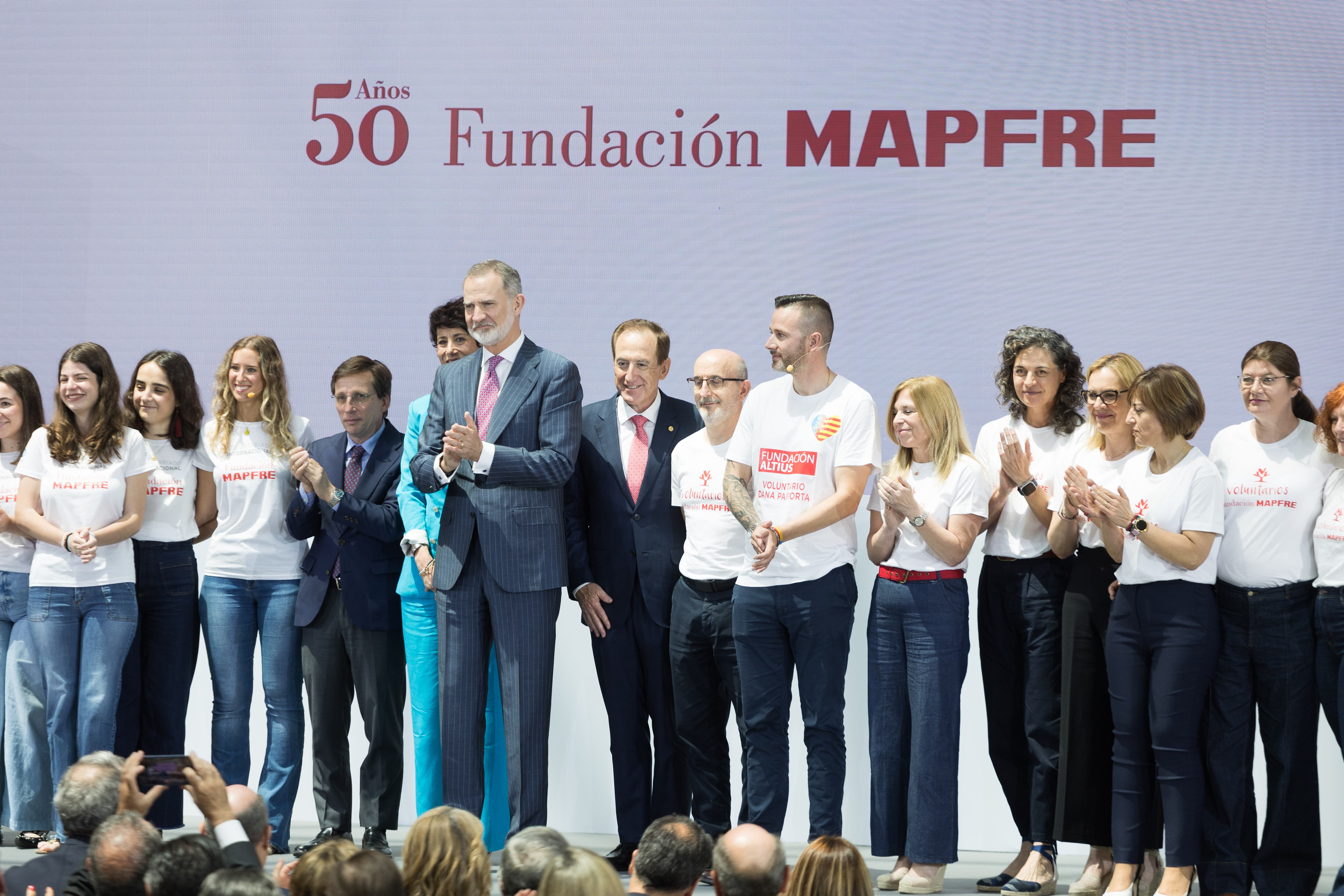 Durante la ceremonia, se nombró a Felipe VI Voluntario de Honor de Fundacion MAPFRE, momento que compartió con una representación de los 9.800 voluntarios que, cada año, colaboran activamente en cerca de 30 países. Algunos de ellos haciendo frente a situaciones de emergencia, como la dana de hace ocho meses en España o las inundaciones que azotaron el sur de Brasil, también en 2024.