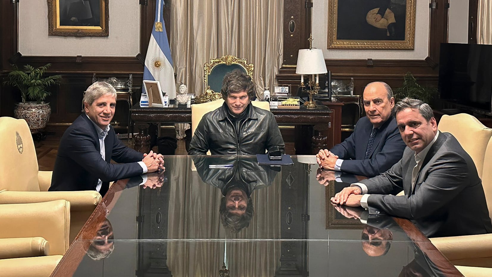 “Siguiendo las instrucciones del presidente, con el objetivo de retomar el diálogo con los gobernadores afines, hemos constituido la Mesa Federal junto al ministro de Economía, Luis Caputo, y al flamante ministro del Interior, Lisandro Catalán“, informó Francos en su cuenta en X junto a una fotografía en la que los cuatro funcionarios posan alrededor de una mesa en el despacho presidencial en Casa Rosada. Milei, como en otras fotos anteriores, está sentado en la cabecera, vestido de cuero negro y la mirada clavada en la cámara, el rostro inclinado levemente hacia abajo y una media sonrisa en los labios. La escenografía obvió, esta vez, la motosierra que el ultraderechista suele colocar en primer plano.