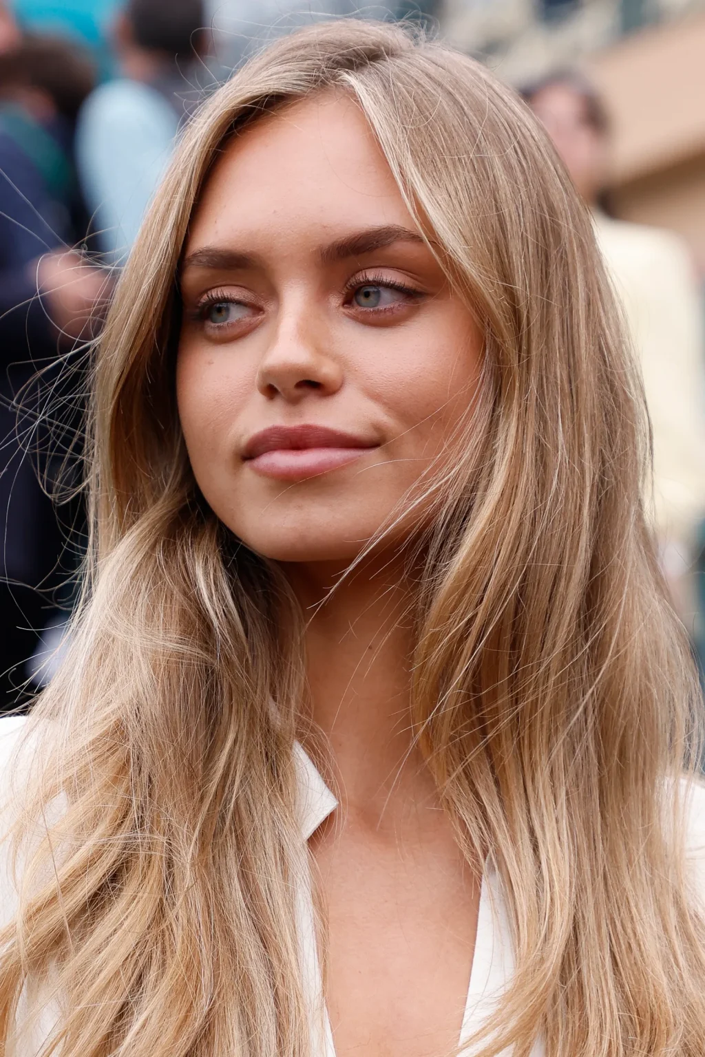 En cuanto al look de belleza, Hasanovic optó por un glamour luminoso y natural, en perfecta armonía con el contexto. Su cabello, largo y rubio, peinado con ondas suaves y la raya ligeramente escorada a un lado, evoca también la sencillez chic de los días en la costa, con un aire pulido pero nunca hiperproducido.