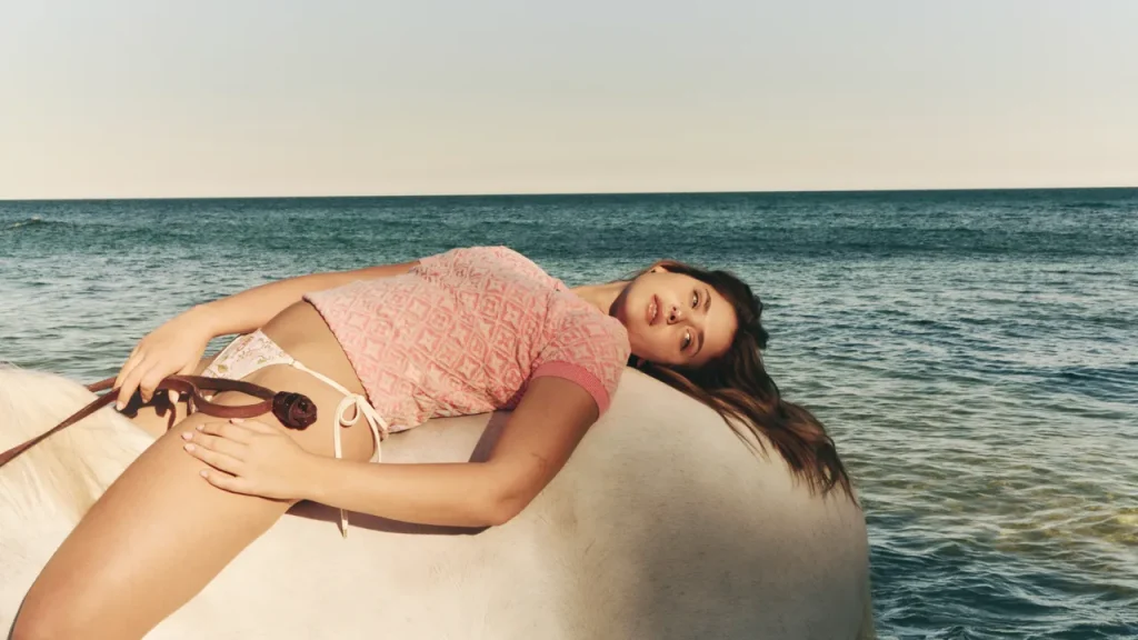 Pero esa serenidad se vio alterada en un instante. Un momento definitorio en toda esta trayectoria fue protagonizar la trilogía de la saga Culpables, la adaptación de los libros de Mercedes Ron. Dos de esas películas se convirtieron, como ya se ha mencionado, en lo más visto en español de Prime Video. El nivel de exposición propició que se hablara de todo alrededor de las producciones – mucho más allá de lo estrictamente profesional– y dejó exhausta a la actriz. “Ni me acuerdo de la gira promocional, la tengo borrada de mi cabeza”, admite con total honestidad. “Pienso que siempre puedo con todo, hago todo y acabo todo lo que llegue. No me importa, me encanta y estoy agradecida, pero eso es un arma de doble filo que afecta principalmente a las mujeres: tenemos que estar siempre agradecidas y en deuda con el trabajo que se nos da –una mentira podrida–”, continúa. “Un momento clave de aquel año se dio en Paris Fashion Week, me acababan de ofrecer el deal de Amazon, venía de una reunión con todos mis repres, de estar una hora y media hablando, y con mis abogados explicándome todo. Entonces me surgieron los dos castings más increíbles de mi vida. Exactamente lo que llevo diciendo que quiero hacer desde los catorce años, estaba ahí. Me ahogué. Apagué el ordenador y tenía a seis niñas en la puerta del hotel gritando, ni siquiera me había dado cuenta. Cerré la ventana y me dio un ataque de ansiedad que no podía con mi alma. Mientras tanto, estaba por ahí todo lo de Culpas”.