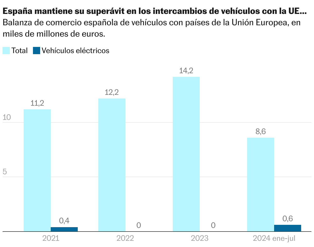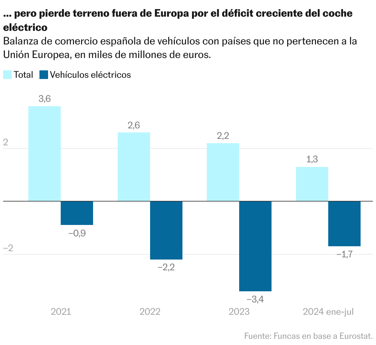 El creciente déficit comercial con China pone de relieve la pérdida de terreno en el vehículo eléctrico. En paralelo, el superávit frente a EE UU tiende a reducirse tras la puesta en marcha del plan de estímulos de Biden. España comparte el declive europeo en los mercados globales, si bien lo compensa parcialmente gracias al dinamismo de sus exportaciones hacia los socios comunitarios.