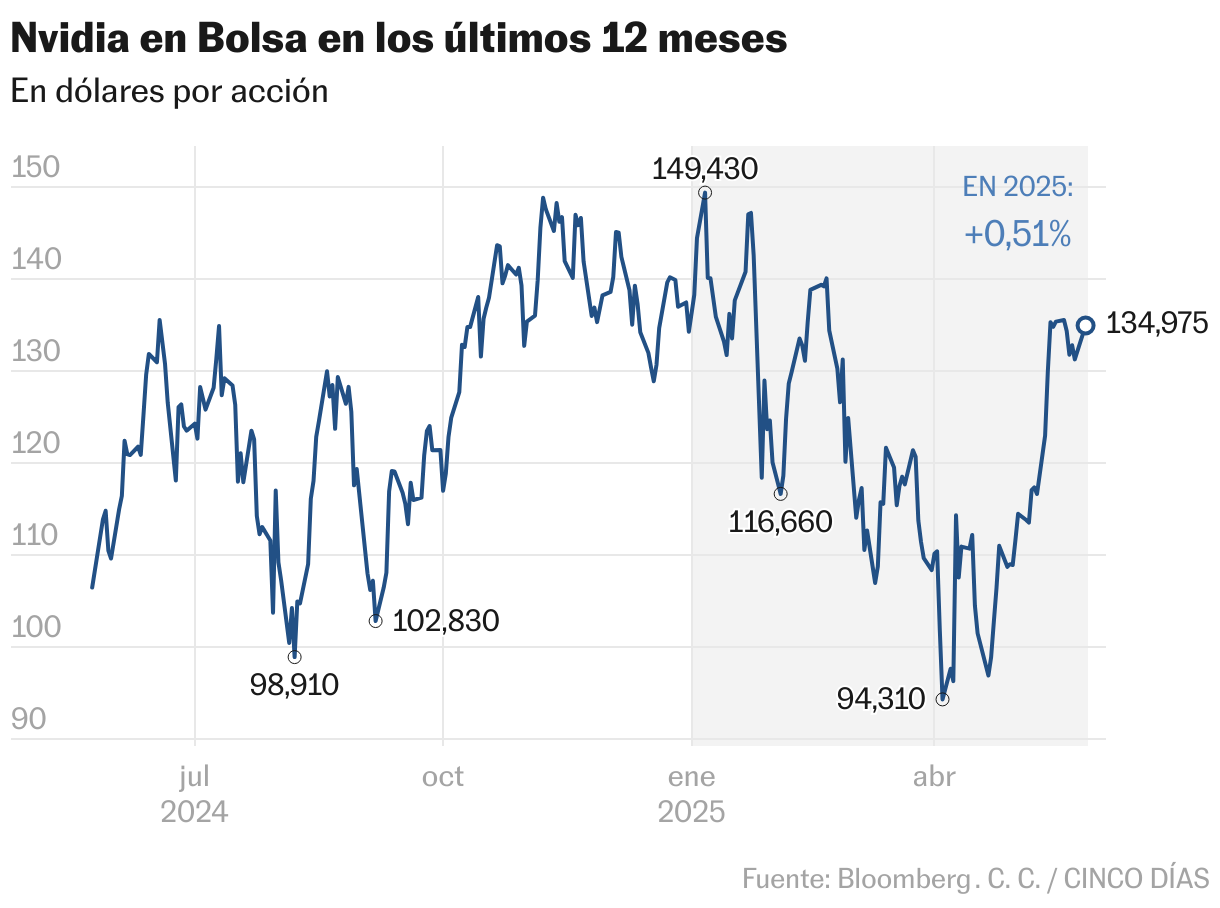 Un gran poder requiere una gran responsabilidad: la capitalización de Nvidia es de 3,27 billones de dólares, solo superada por Microsoft. Así, los resultados que presente el coloso de los chips pueden marcar el rumbo de todo el mercado bursátil estadounidense. Al S&P 500, índice de referencia de EE UU, le ha sentado muy mal el disparate de Trump. Tras el día de la liberación, el índice perdió un 12% de su valor de mercado en solo cuatro días. La tregua anunciada (aún vigente) le dio un respiro y recupera terreno: un 18,2% desde entonces a la fecha. Ahora el índice quiere volver al punto máximo logrado a inicios de 2025, pero aún está un 4,1% por debajo de esa cima.