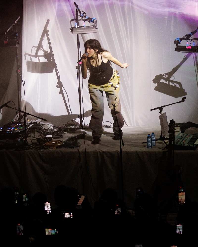 Aún así, es fascinante la curiosidad con que Oklou aborda su obra, mezclando influencias de pop, R&B, música clásica y música medieval con texturas electrónicas futuristas y nebulosas. Su voz, un hilo digitalizado, suena curiosamente humano. Esa misma curiosidad lleva a Oklou a aparecer sobre el escenario armada con una linterna, iluminando la oscuridad del público como si acabara de cruzar un portal hacia otra dimensión y tratara de averiguar adónde ha llegado. Ella es una exploradora musical que se sumerge en aguas profundas en ‘thank you for recording’ -que abre el show- o la inédita ‘side’, o que lleva a la artista a transformar ‘fall’ en una pieza agresiva de la mano de A.G. Cook, cuando la versión original no podía sonar más arropadora.