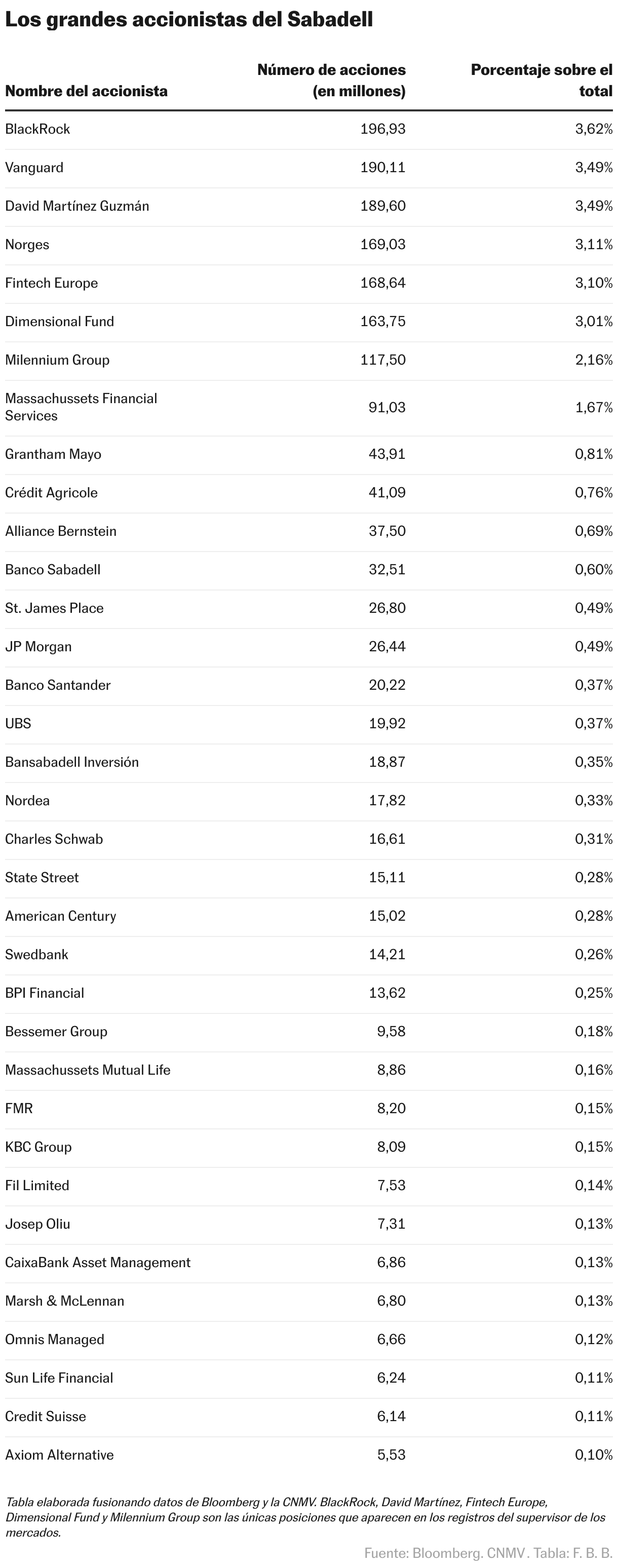 En los últimos resultados disponibles, los correspondientes al primer trimestre de 2024, Sabadell desglosaba que 24 accionistas concentraban el 46,62% del banco en aquel entonces. Atendiendo a los registros de la CNMV, BlackRock (3,62%), David Martínez Guzmán (3,49%), Fintech Europe (3,1%), Dimensional Fund (3,01%) y Millennium Group (2,16%) son los principales accionistas del Sabadell. Con todo, es importante puntualizar que en el registro de la CNMV no aparecen todos los grandes accionistas, sino solo aquellos obligados a notificar su posición al supervisor. Con el fin de completar los registros oficiales, la agencia estadounidense Bloomberg recaba de diferentes fuentes quiénes son los accionistas del banco. Teniendo en cuenta que la suma de los 24 primeros no coincide con ese 46%, tampoco están todos los accionistas al completo, pero sí que los que recapitula Bloomberg son también accionistas. Preguntados por si podían facilitar una lista exhaustiva del principal accionariado y una relación de las posiciones, fuentes del Sabadell remitieron al recopilatorio de Bloomberg como la opción más fiable.