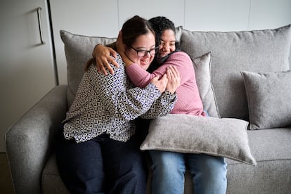 Esos ratitos les han ayudado a entenderse y a apoyarse porque, para Galve, el cambio ha sido fuerte: “Yo lo que más de menos echo es a mis compis, que los he tratado muy a gusto y ellos me han enseñado cómo hacer las cosas”. Así que los invitaron a casa a cenar. “Me emocioné un poco al verlos a todos aquí”, recuerda. A Galve le han concedido el servicio de catering, pero hasta el momento se han organizado ellas: “Ana sí sabe hacer sus alimentos, lo que necesita es que la acompañe para que ella esté segura de lo que está haciendo. Entonces, si le falta la sal, le oriento”. Aquí, ríen, han encontrado más obstáculos. “Me pidió que la ayude a hacer una tortilla de patatas y yo no sé, yo soy de Colombia, entonces tuvimos que mirar un tutorial”, narra Vera. En todo lo demás, son independientes. Vera trabaja en una tienda de zapatos y estudia un máster, y Galve acude todas las mañanas a la asociación donde se forma para poder trabajar: “Hacemos actividades en el ordenador, en el Excel, cosas de cocina…”.