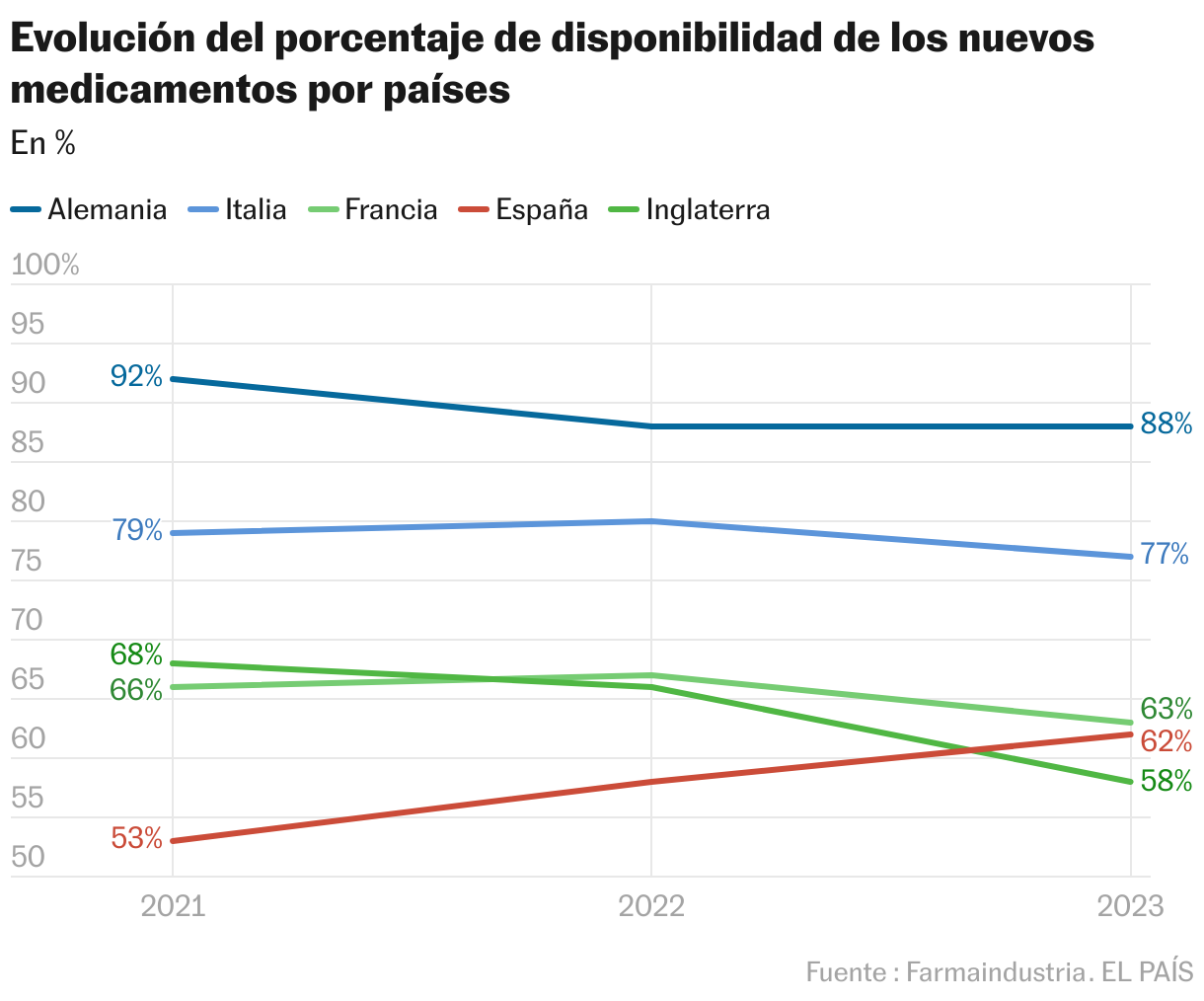 Una de estas carencias a las que Moreno hace alusión es el tiempo de espera que pasa desde que un fármaco es aprobado por la Agencia Europea de Medicamentos hasta que está disponible en el mercado. En España este tiempo de espera, en el que la Administración lleva a cabo todos los procesos de regulación, fue de 616 días en 2024. Son 50 días menos que el año anterior, pero todavía está muy lejos de los 301 de Estados Unidos, los 391 de China o los 128 días en Alemania, el valor más bajo en Europa.