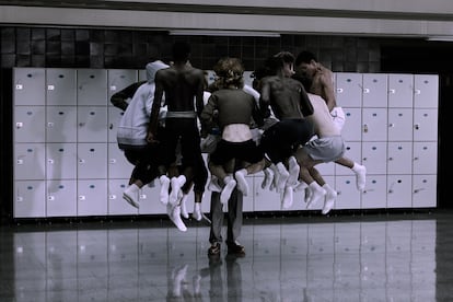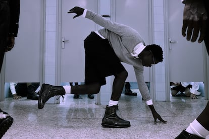 Miguel Fluxá, director general de Camper desde 2012, recuerda su lanzamiento. “Cuando se lanzaron, en 1995, yo estaba en la universidad, y los llevé desde el primer momento. Los míos eran como zapatos de bolera. Al principio la gente los miraba con curiosidad. Los utilicé tanto que los destrocé. Ahora están en el archivo”. Probablemente fuera ese par, o uno parecido, el que inspiró al diseñador Ion Gabriel para imaginar nuevas versiones del modelo, que protagonizan estas imágenes entre lo escolar y lo fiestero.