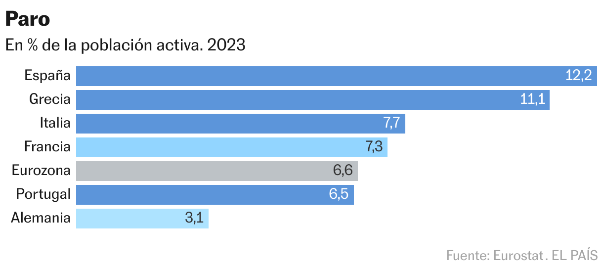 En un mundo envejecido y con crecientes problemas de mano de obra, el paro, histórico talón de Aquiles sureño, también está permitiendo un impulso adicional frente a un norte con mercados de trabajo cada vez más tensos. “Un desempleo alto frena el bienestar, pero también quiere decir que hay potencial aún por desbloquear. Con otros países en pleno empleo, esto podría ayudar a que cualquier proyecto se lleve a cabo más rápido en el sur de Europa”, desliza Bert Colijn, de ING.