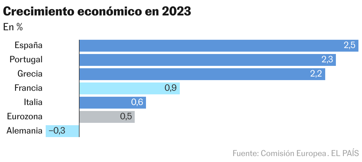 Los cinco países del euro que más crecieron el año pasado fueron sureños: Malta (6,1%) y los cuatro rescatados la década pasada, España (2,5%), Chipre (2,4%), Portugal (2,3%) y Grecia (2,2%). Tasas, todas ellas, muy superiores a las de un norte estancado: Alemania cayó un 0,3%; y Países Bajos, quinta economía del euro, creció apenas dos décimas. La tónica se repetirá este año: Malta volverá a liderar la tabla (4,6%), seguido por Chipre (2,8%) y Grecia (2,3%), según las últimas previsiones de Bruselas, y con los dos países ibéricos a un paso de ellos (2% para España y 1,8% en el caso de Portugal, con varios organismos mejorando esas cifras mes tras mes). La sensación general es que, mientras el norte va a menos o, en el mejor de los casos, se estabiliza —Alemania, Países Bajos y Finlandia, el triunvirato frugal, rondarán el 0%—, el sur va a más.
