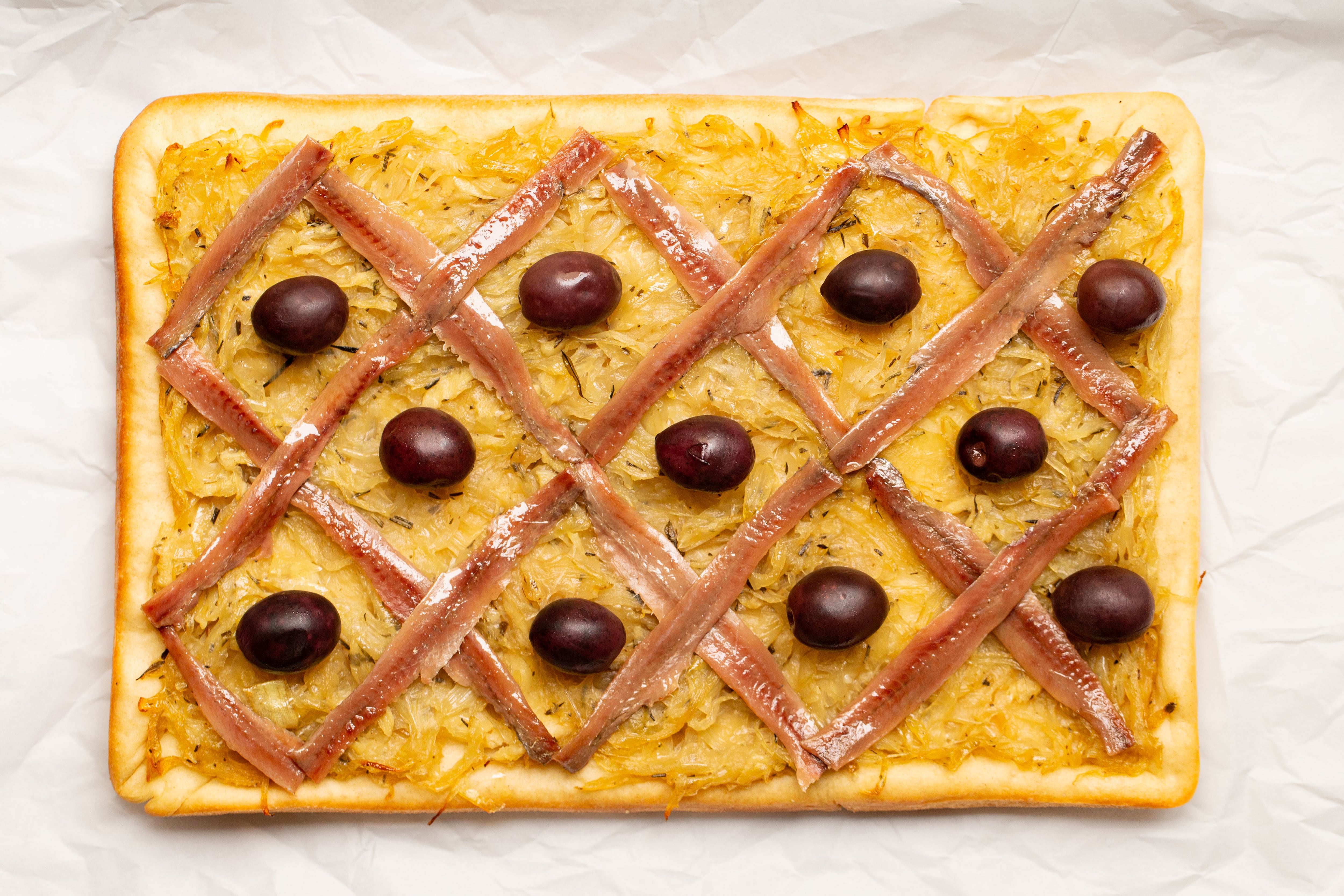 Si es la primera vez que lees la palabra pissaladière, imagina algo muy similar a una pizza o una coca. Pertenece al recetario de la Provenza, al sureste de Francia, aunque se vincula de forma más concreta con la cocina de Niza. La masa base se prepara principalmente con harina, levadura, aceite de oliva y agua y después de horneada es muy similar a una pizza algo gruesa. Encima de esta masa se añade cebolla casi caramelizada con hierbas provenzales deshidratadas –mezcla que puedes comprar ya lista–, filetes de anchoa formando un bonito enrejado y aceitunas negras.