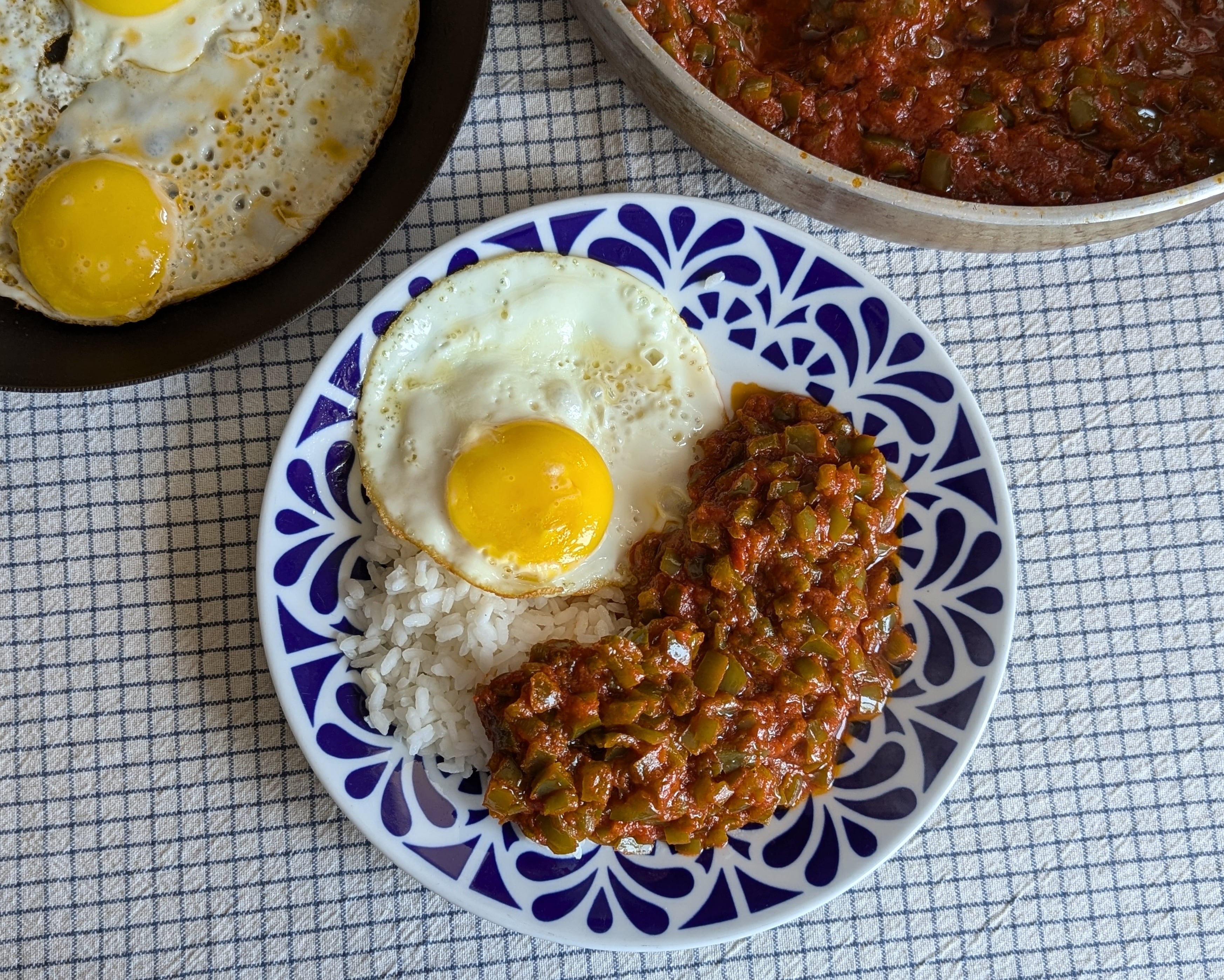 El tomate admite variaciones, por supuesto: la passata no es el formato más canónico, pero así aprendí de mi fuente de Ciudad Real y queda muy bien. Si quieres ser más manchega que Joaquín Reyes, puedes usar tomate triturado o lo que suelas utilizar para hacer salsas de tomate. ¿Cómo se toma el pisto? La forma más clásica es tal y como lo propongo en la foto: con arroz blanco y huevo frito. Pero su grandeza está en ser un apañacomidas fantástico: queda genial en una tostada -solo o con un poco de queso fresco-, puede aliñar unas judías verdes cocidas, se puede usar para completar un taco o una fajita, o sencillamente con cuscús.