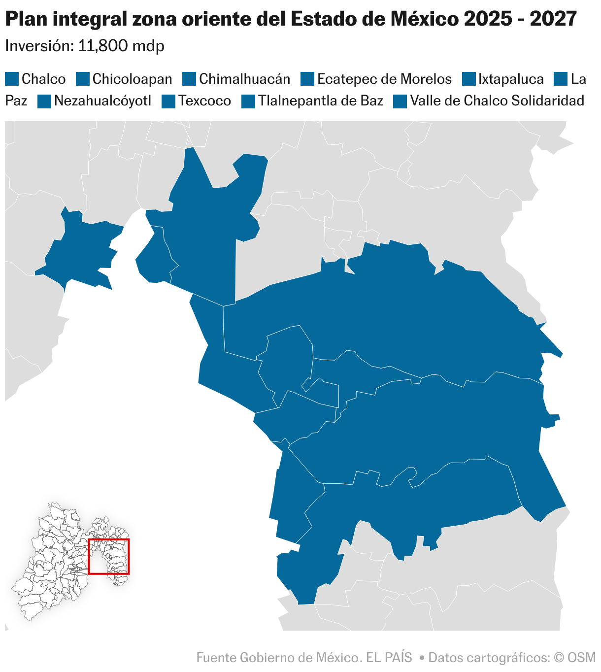 “Es una deuda, no solo del Gobierno, sino de todo México, porque en estas zonas se concentra la mayor pobreza urbana del país”, ha dicho Sheinbaum en su conferencia matutina, en la que ha convocado a los siete secretarios de las distintas carteras para que informen de las tareas que cada uno deberá desarrollar. En el Palacio Nacional han intervenido también la gobernadora del Estado de México, Delfina Gómez, y alguno de los alcaldes concernidos. Todo un despliegue para detallar uno de los proyectos más acuciantes y relevantes del sexenio, ha dicho la presidenta. Y no son pocos, la pobreza en México alcanza a más de 46 millones de personas, muchas de ellas en el mundo rural, afectadas por el hambre y parecidas carencias a las que presentan las periferias urbanas. El esfuerzo presupuestario de esta iniciativa saldrá en un 60% del Gobierno federal, un 30% del gobierno estatal y un 10% de los Ayuntamientos.