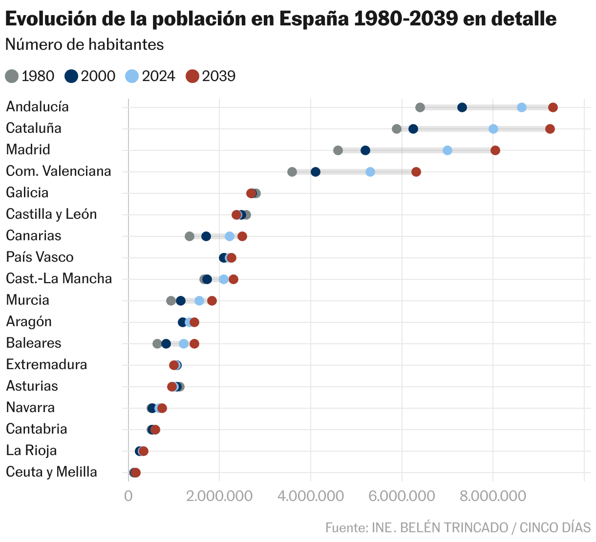 Las previsiones apuntan a que esta divergencia en la evolución demográfica se va a ir agravando. En 1980, el 62,6% de los españoles vivía en las siete comunidades mencionadas, porcentaje que será diez puntos superior en 2039, según las proyecciones realizadas por el INE el año pasado. Por tanto, el fenómeno de la concentración de la población en la costa, centro y archipiélagos no para, con el agravante de que se trata de las zonas con más necesidad de recursos básicos como agua y electricidad, que proceden de otras regiones, y que son las más amenazadas por fenómenos como la desertización y el cambio climático.