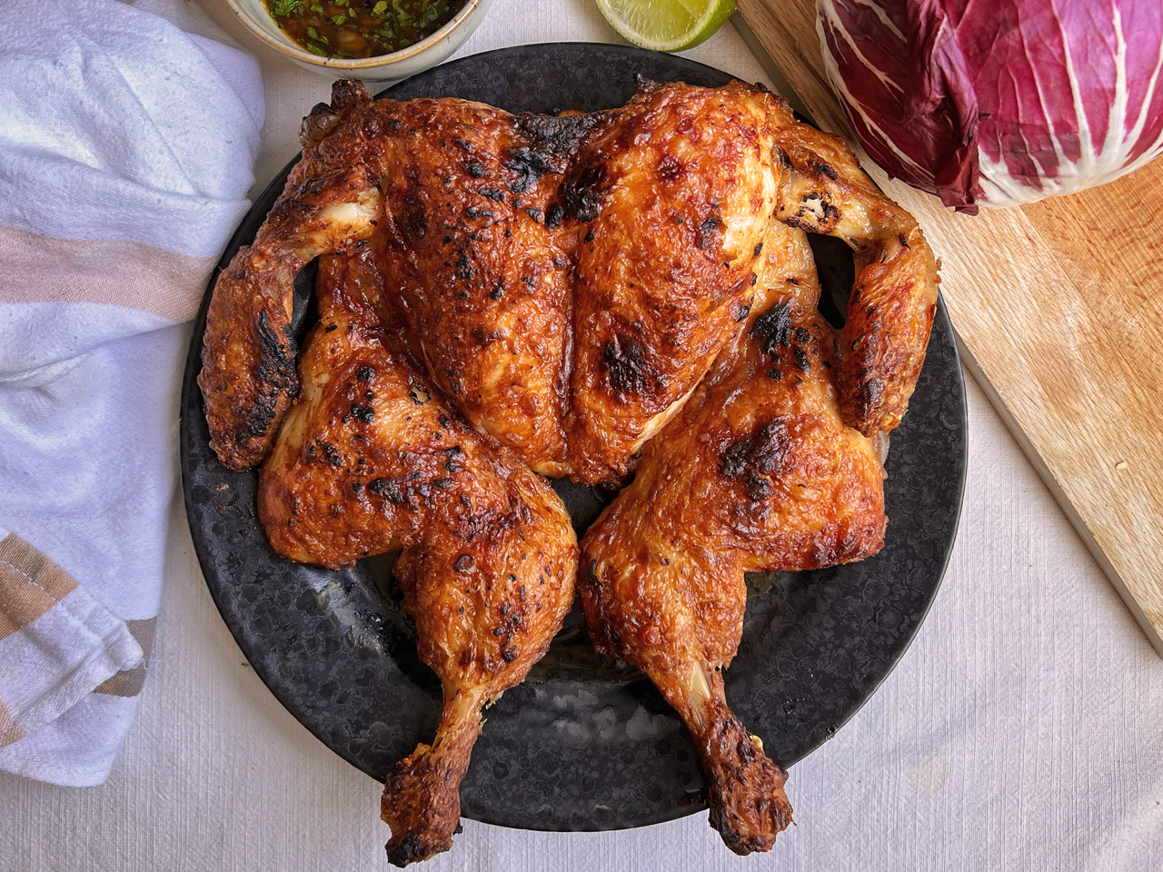 Partimos de que, para conseguir que algo esté crujiente, necesitamos eliminar todo rastro de humedad. La mejor forma de conseguirlo es adquiriendo nuestro pollo el día anterior: tras abrirlo en mariposa, lo untamos bien con sal y levadura química. Si lo dejamos sin tapar en el frigorífico, conseguiremos que la humedad de su interior salga por ósmosis y se seque. Mientras más tiempo esté así, mejor, pero si vais con prisa a partir de las tres horas empieza a funcionar.