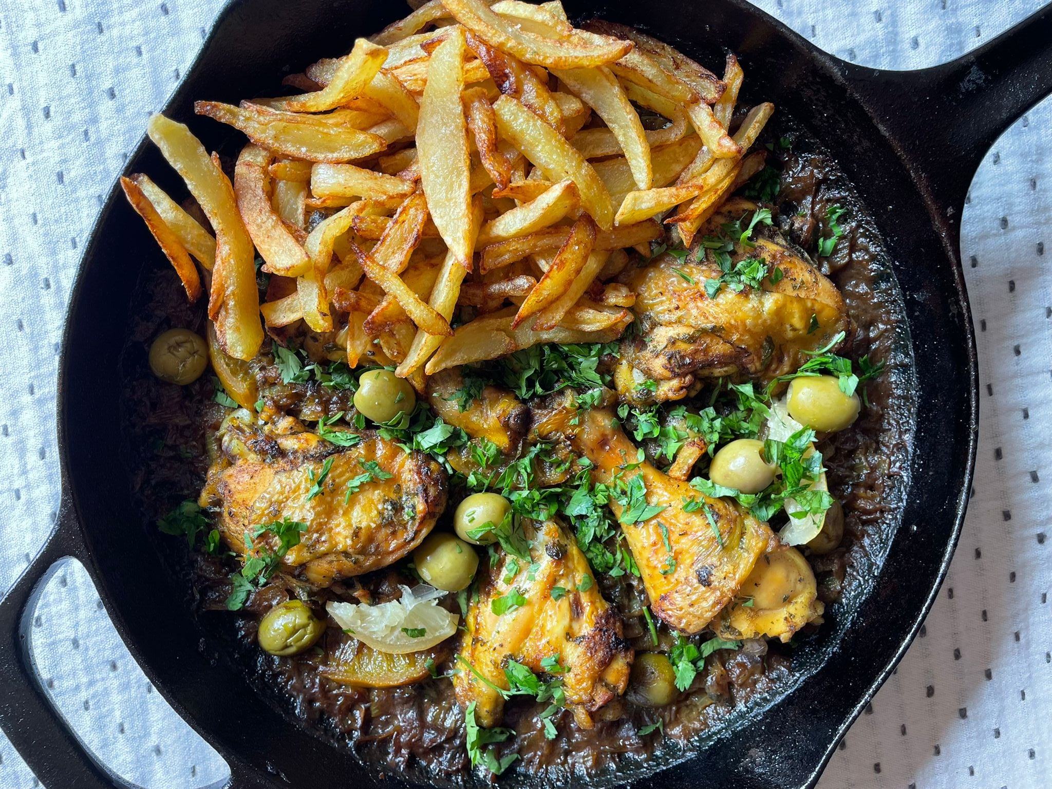 ¿Hay algo más básico que el pollo con patatas? “Básico” no es para nada malo, me refiero a que es un plato elaborado con productos accesibles, riquísimo y que está en el recuerdo dominguero de todo el mundo. Es una de mis combinaciones favoritas, por eso quería darle otro toque, y descubrí que nuestros vecinos al otro lado del estrecho usan ingredientes que levantan el plato a otro nivel.