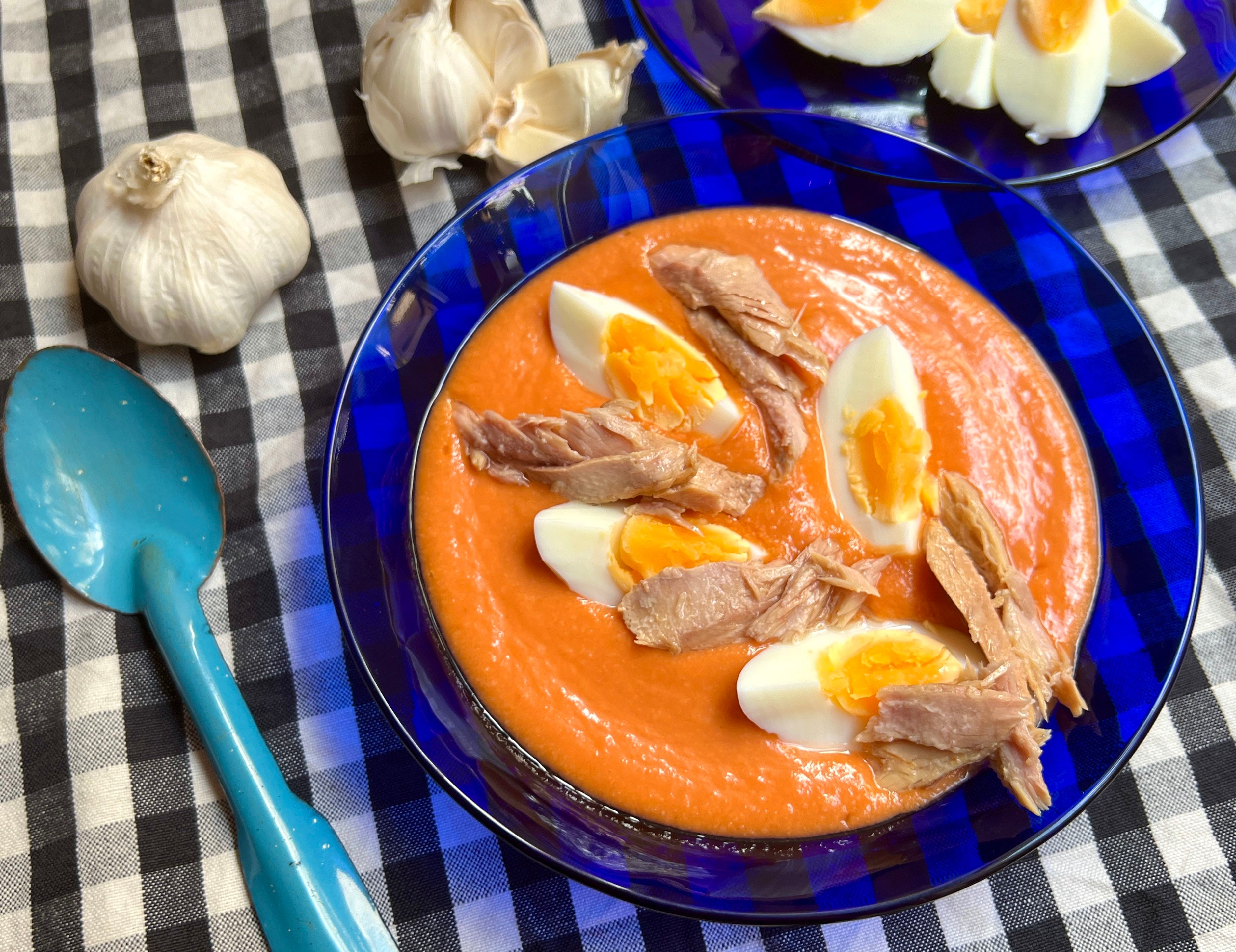 Si no tienes a mano el pan cateto que usa la receta original -típico de Andalucía, elaborado con harina de trigo duro y baja hidratación- puedes usar candeal o cualquier pan blanco de textura compacta y sin mucha corteza (si no es el caso, siempre puedes quitarle una parte). El recetario cuenta que se sirve adornada con huevos duros cortados en cuartos y trocitos de jamón serrano “aunque se puede acompañar de cualquier ingrediente, siempre y cuando no sea dulce, como patatas fritas, atún o bacalao desmenuzado”, y le hemos puesto unos lomos de bonito en aceite.
