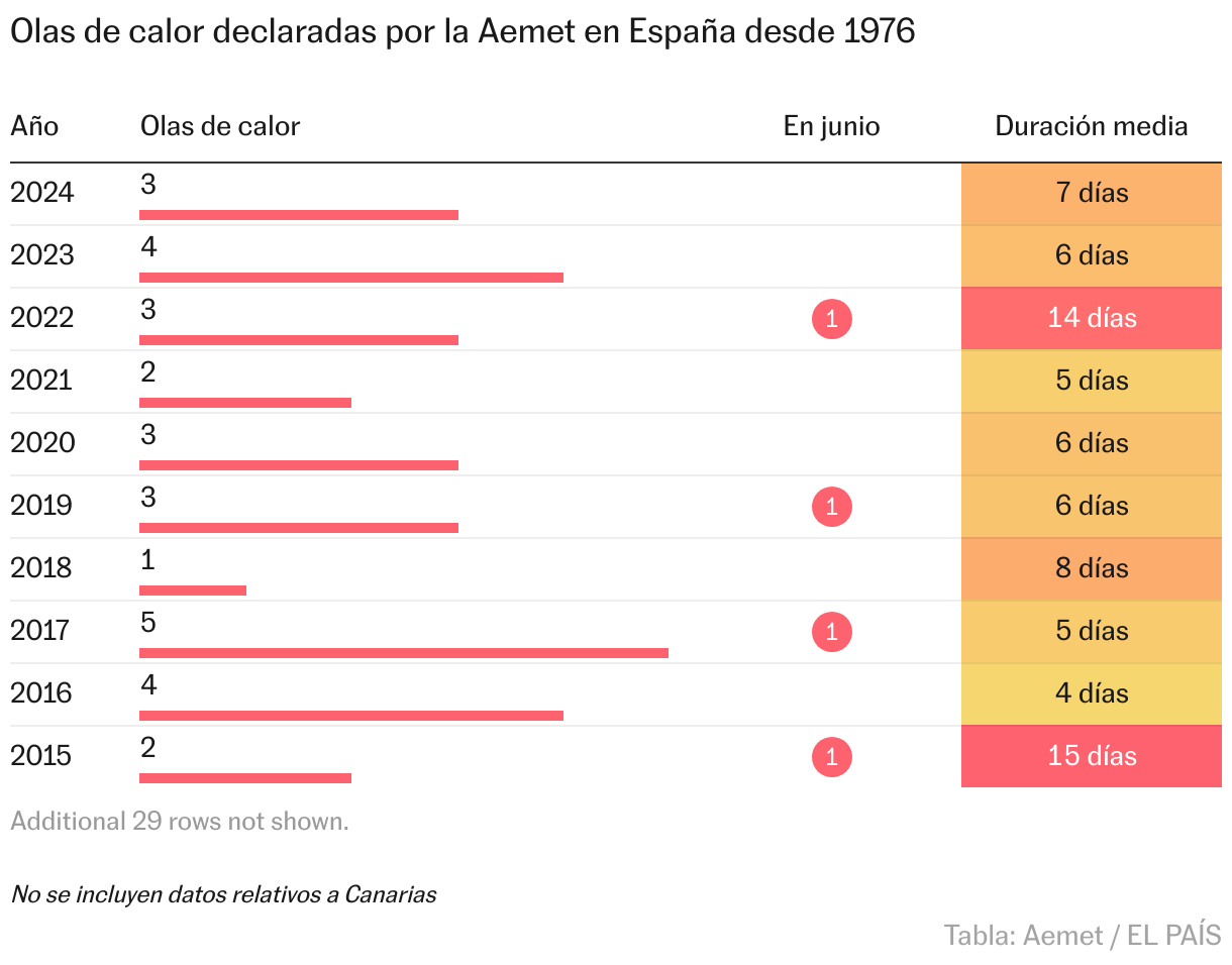 España afronta a partir de este sábado la que se prevé que sea la primera ola de calor del verano. Se trata de un episodio temprano: solo 11 de las 75 olas que la Agencia Estatal de Meteorología (Aemet) ha contabilizado desde 1975 en la Península se iniciaron en junio. Los eventos de calor extremo tienen incidencia directa en la salud, al agravar enfermedades e, incluso, elevar la mortalidad.