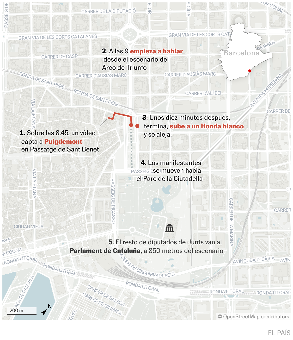 Puigdemont ha salido de un bloque de pisos y, rodeado por sus compañeros de partido, ha avanzado sin ninguna oposición hasta el atril. Ha pronunciado un discurso inflamado y, al finalizar, ha desaparecido entre la gente rodeado por sus fieles en el partido pese a las decenas de policías que había desplegados en la zona. “La primera parte del plan ha salido bien”, ha comentado después una fuente cercana al mando de Junts.