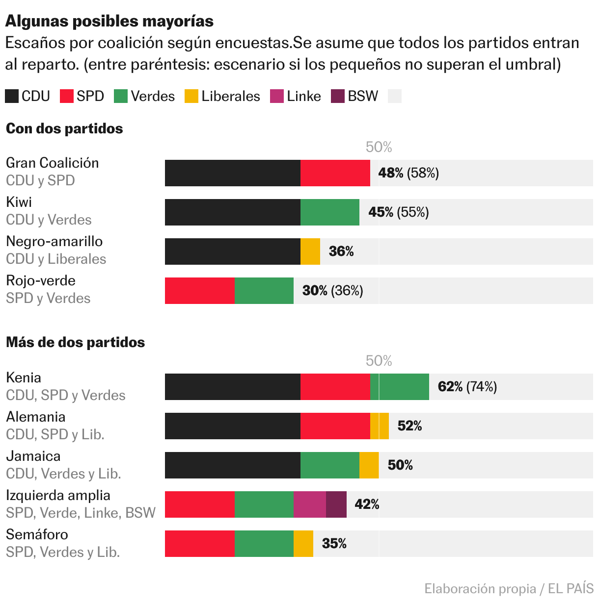 Una de las incógnitas el domingo es conocer el porcentaje exacto de votos de estas tres formaciones, porque se juegan poder entrar al reparto de escaños (y, por tanto, la posibilidad de condicionar el próximo gobierno). El sistema electoral alemán exige una de dos condiciones para entrar al Bundestag: bien superar el 5% de voto a nivel nacional, o bien ganar en tres circunscripciones. Con estos sondeos, la entrada de Die Linke parece muy probable, mientras que las de BSW y FDP están aproximadamente al 50%.