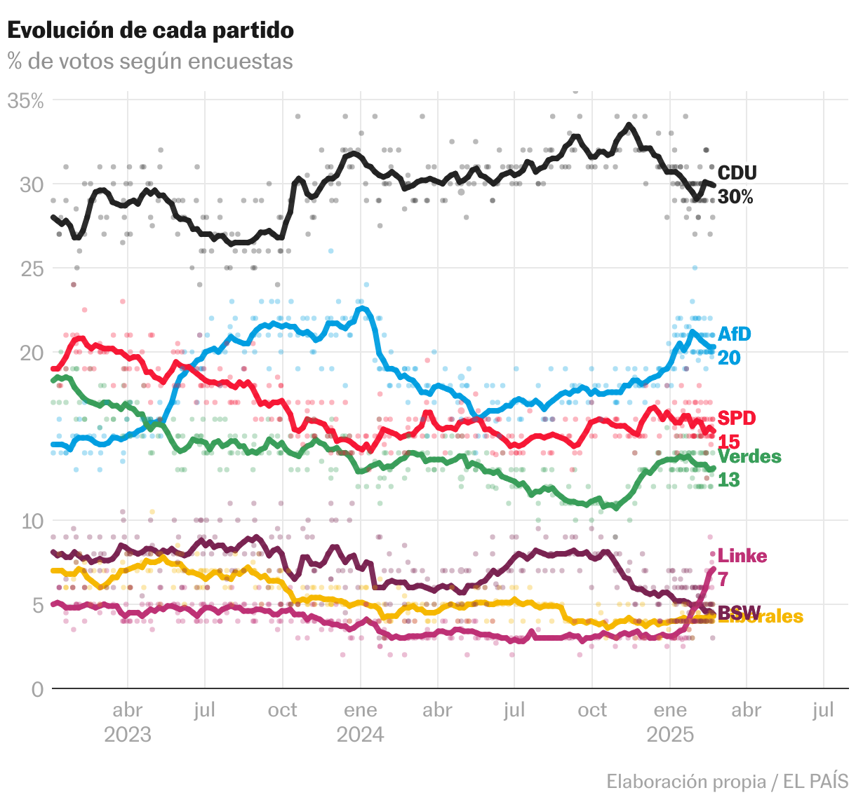 Ni AfD ni los conservadores se han movido en los sondeos recientes, pero sí hay cambios en la izquierda. Die Linke ha crecido rapidísimo desde enero, pasando del 3% al 7%, mientras se reducen los apoyos de los socialistas (caen un punto) y del BSW, el partido surgido como escisión de Die Linke, que retrocede del 6% al 5%.