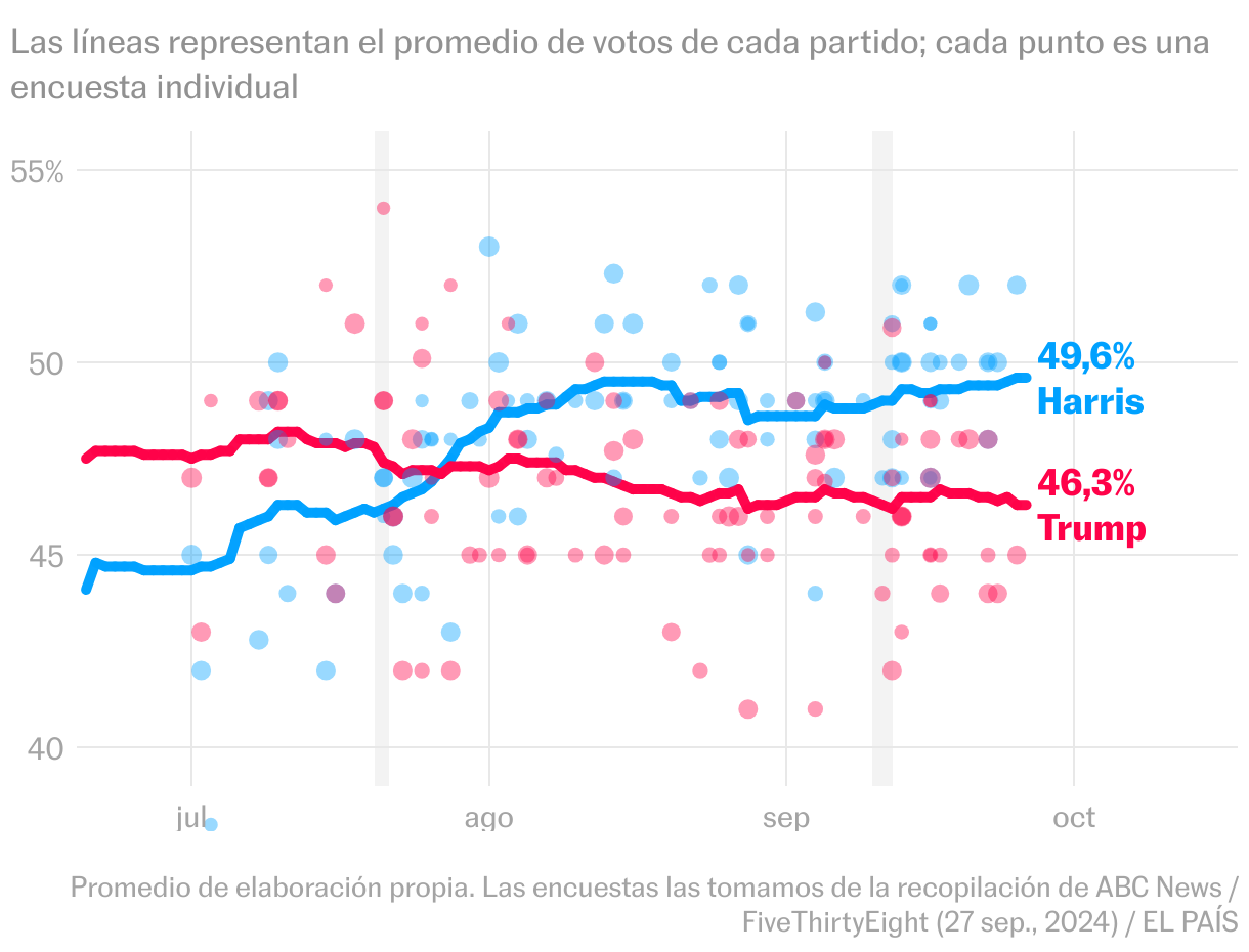 En realidad, el cambio es pequeño y la carrera está casi congelada. Desde el debate electoral, hace un par de semanas, apenas hay movimientos. En las encuestas nacionales Harris está tres puntos arriba, solo unas décimas mejor que en agosto. Además, la pelea determinante, que es la los llamados Estados clave, apenas registra cambios en sus datos.