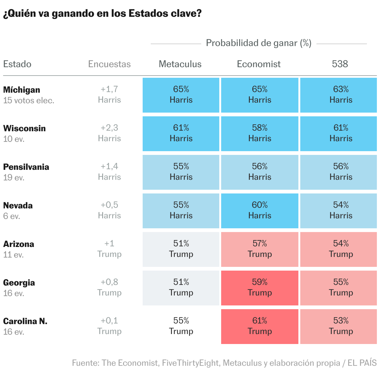 Los movimientos en los Estados también han sido pequeños. Trump ha mejorado en el modelo de FiveThirtyEight, y es un poco más favorito en Arizona, Georgia y Carolina del Norte. Pero Harris no ha retrocedido en Míchigan, Wisconsin, Pensilvania y Nevada, los Estados que le dan la ventaja y que, prácticamente, necesita.