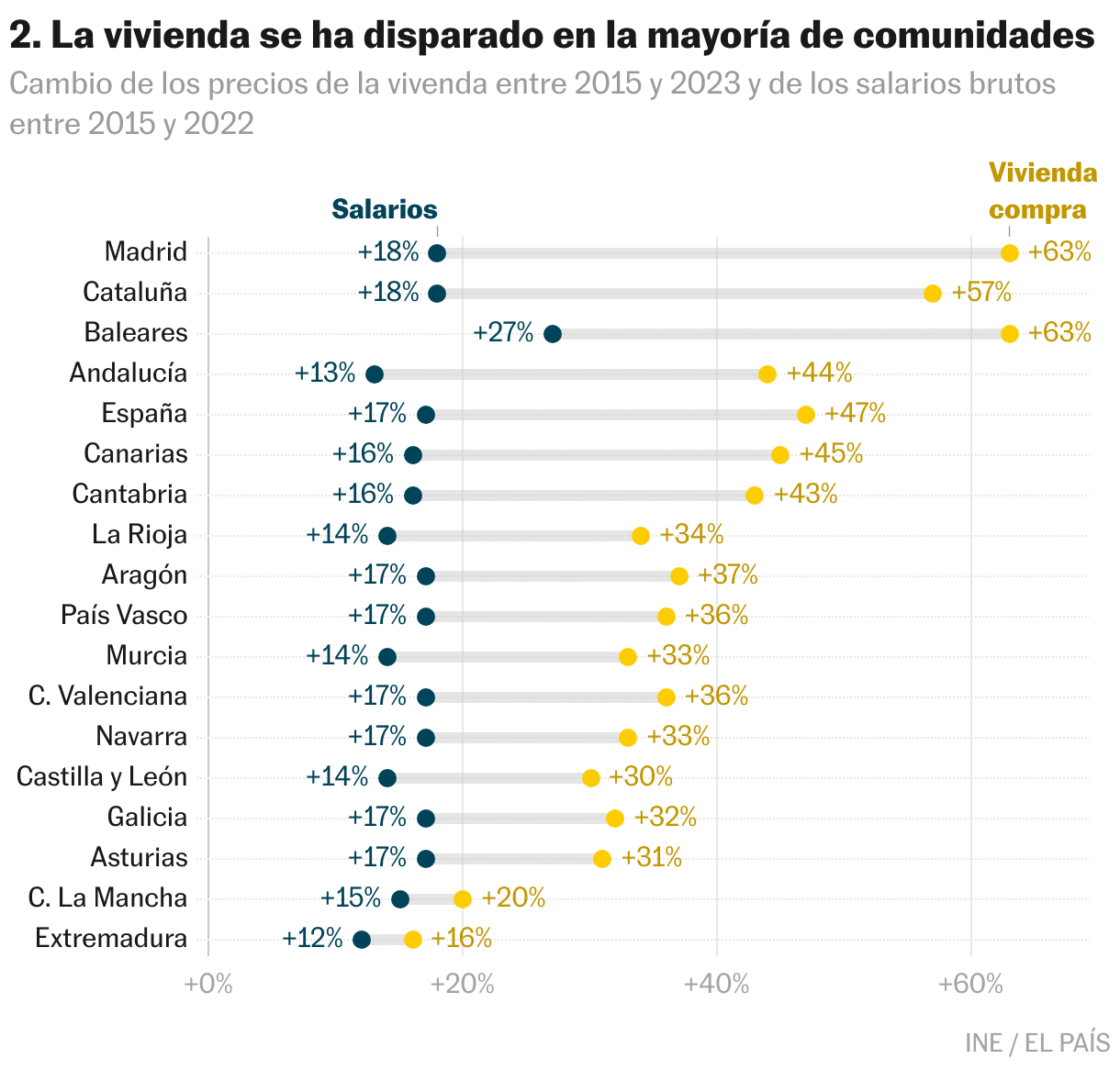 La brecha entre ingresos y precio de la vivienda es especialmente intensa en las regiones donde las casas se han encarecido con más fuerza, como Madrid (63% de subida), Cataluña (57%) y Baleares (63%). Los salarios en esos lugares no han subido en absoluto al mismo ritmo.