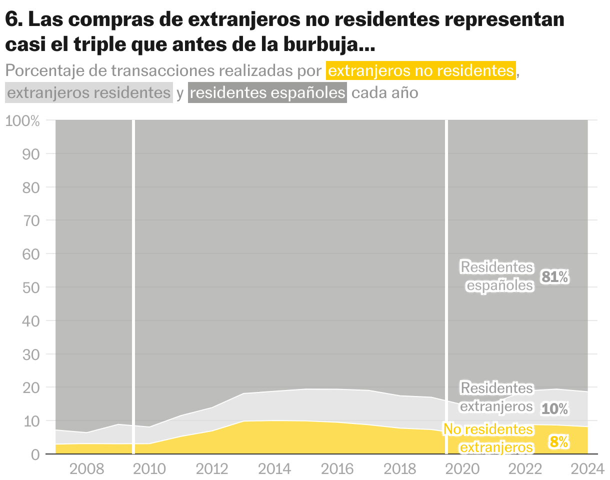 Otro factor que aumenta la presión sobre la oferta de vivienda es el aumento de las compras que realizan los extranjeros no residentes en España. Durante la burbuja apenas representaban el 3% del total de transacciones, pero cuando estalló se triplicaron hasta el 10%. En los últimos años, este porcentaje se ha suavizado: entre 2022 y 2023 sumaron más de 100.000 transacciones, un 8% del total.