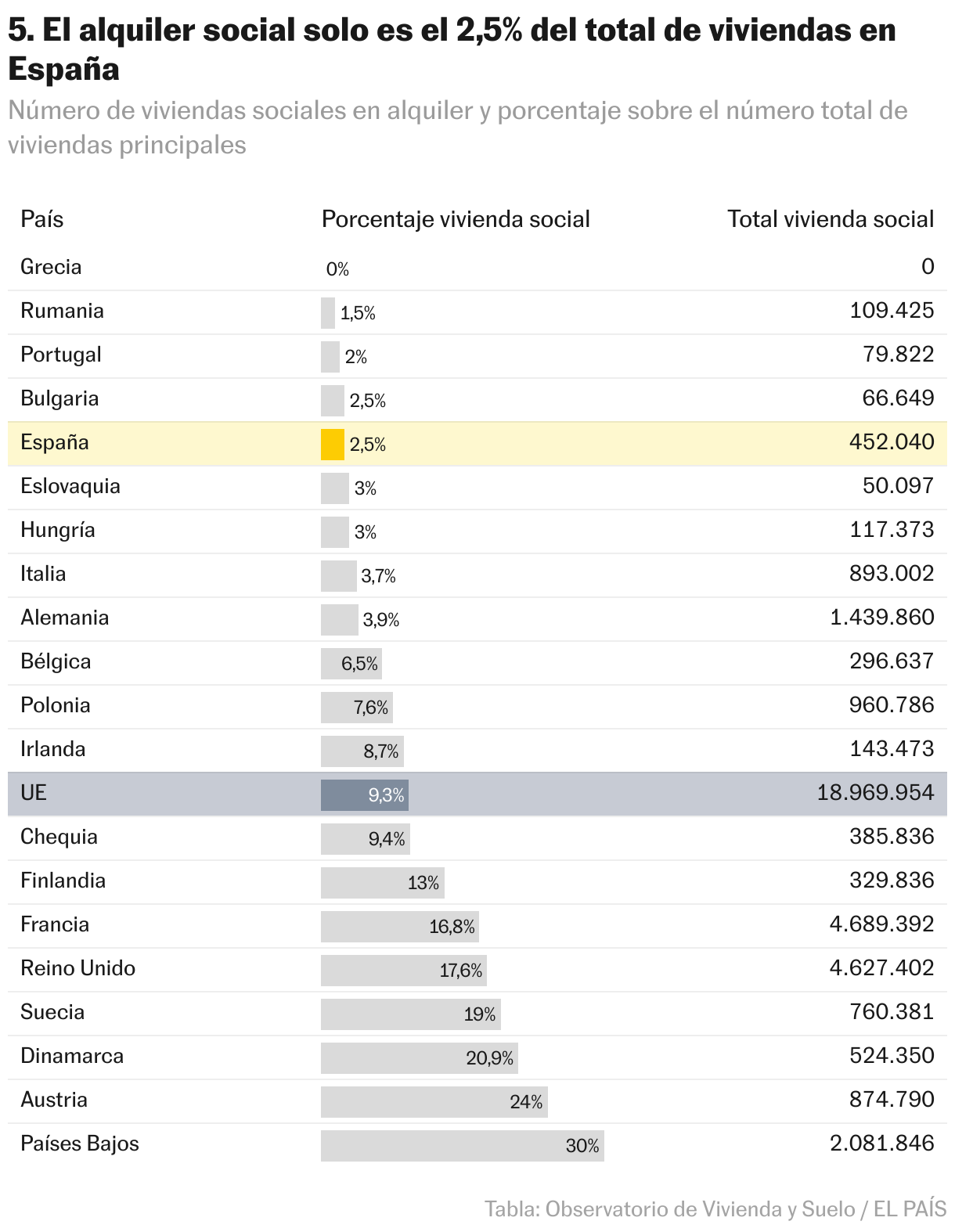 Otro factor empujando los precios es la limitada oferta pública de vivienda, en régimen de propiedad o en alquiler. Es una fórmula para reducir la demanda a precios de mercado libre. España es uno de los países de Europa con menos alquiler social: apenas el 2,5%, tanto como Bulgaria y lejos del 17% de Francia y Reino Unido o del 30% de Países Bajos.