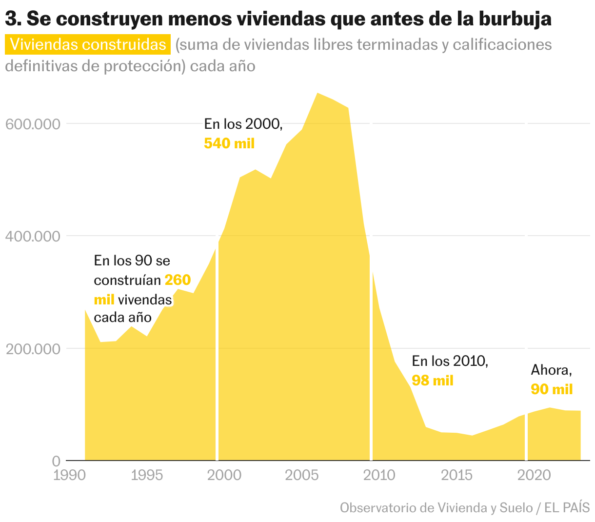 Una de las causas, según muchos expertos, es la construcción. Durante la burbuja inmobiliaria —hace ya dos décadas—, en España llegaron a levantarse 600.000 viviendas en un año. Las grúas cayeron en picado con la crisis y desde entonces se construyen unas 90.000 viviendas cada año en España. En los noventa, incluso en los momentos de crisis, se construían prácticamente el triple.