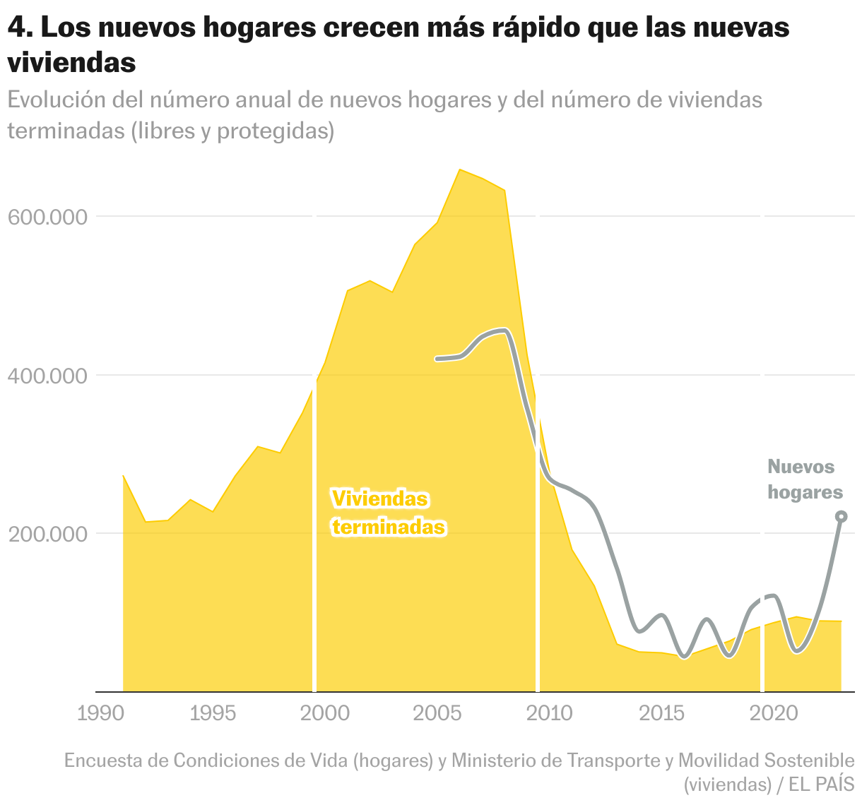 Además, ha cambiado otra cosa. La creación de nuevos hogares colapsó con la crisis, en parte porque la economía retrasó la independencia de los jóvenes y porque la inmigración se frenó. Pero ahora vuelve a crecer. En 2023, el número de hogares subió en 220.000, el doble de lo que venía siendo habitual. Esos nuevos hogares no han activado la construcción de nueva vivienda, como muestra el gráfico.