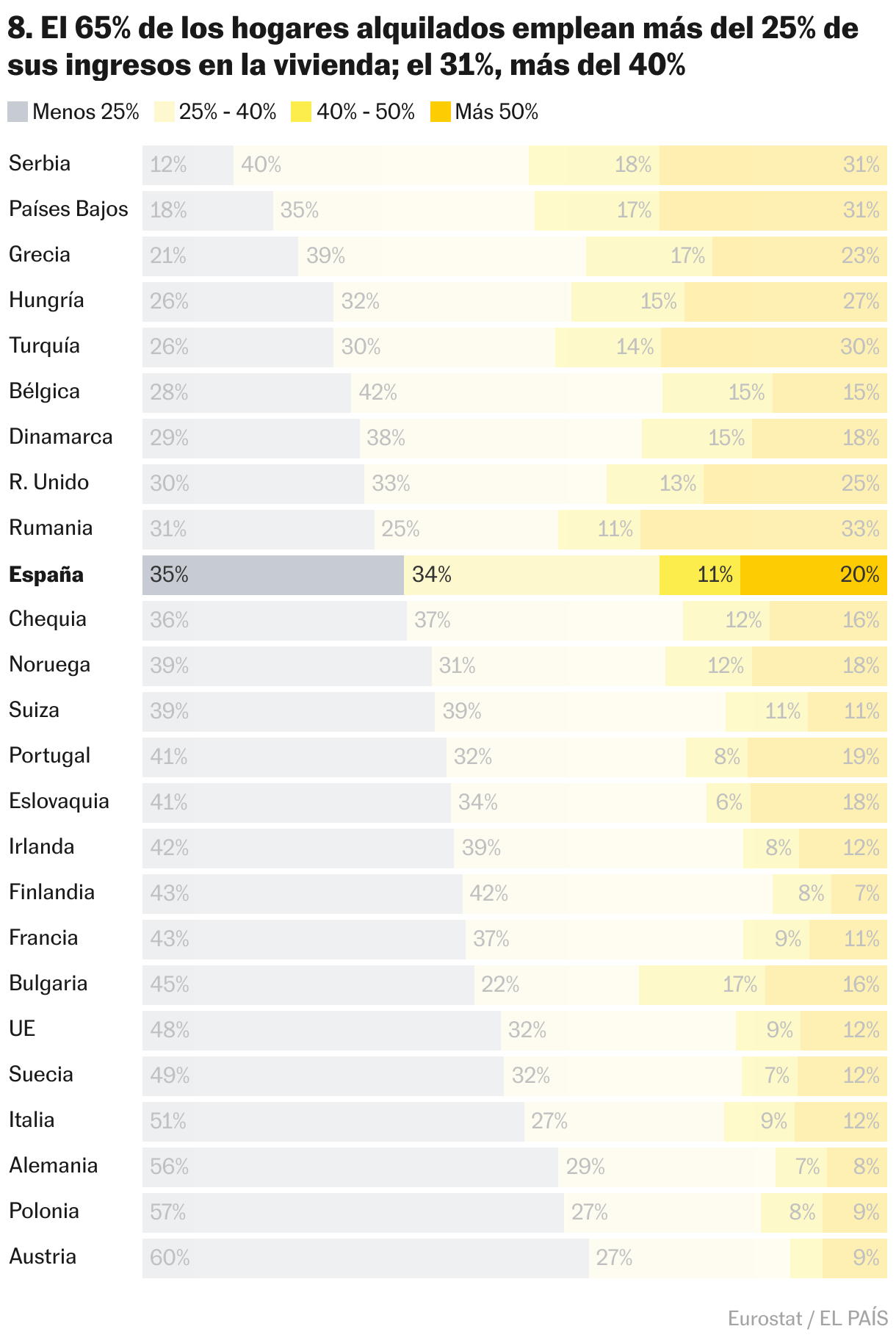 Las consecuencias de la escalada de los precios se evidencian en multitud de indicadores. El primero es la asfixia de muchos presupuestos familiares. Ahora mismo, pese a las buenas cifras de empleo, un tercio de los hogares españoles que viven de alquiler dedican más del 40% de sus ingresos a pagar la casa. Los que dedican menos del 25% apenas son un 35%, por debajo de la media de la UE (48%) y lejos de países como Suecia (49%) o Alemania (56%).