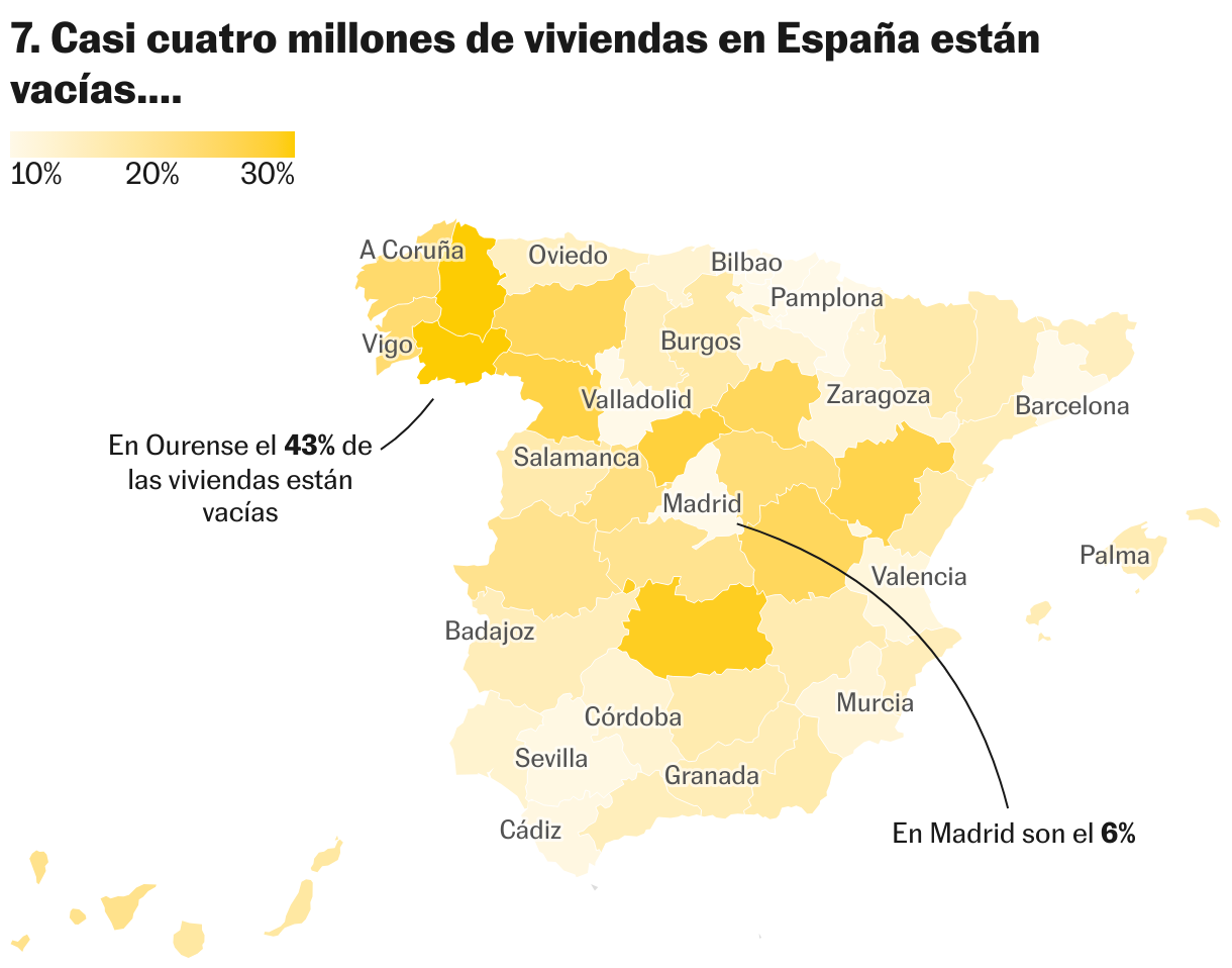 Cuando se habla del parque de vivienda en España hay que tener en cuenta que 4 millones de ellas están vacías, una de cada siete. Este porcentaje es más alto en las provincias más despobladas, como Ourense, donde cuatro de cada diez casas no están habitadas. En Ciudad Real, Teruel, Zamora, Cuenca o Segovia son más de dos de cada diez.