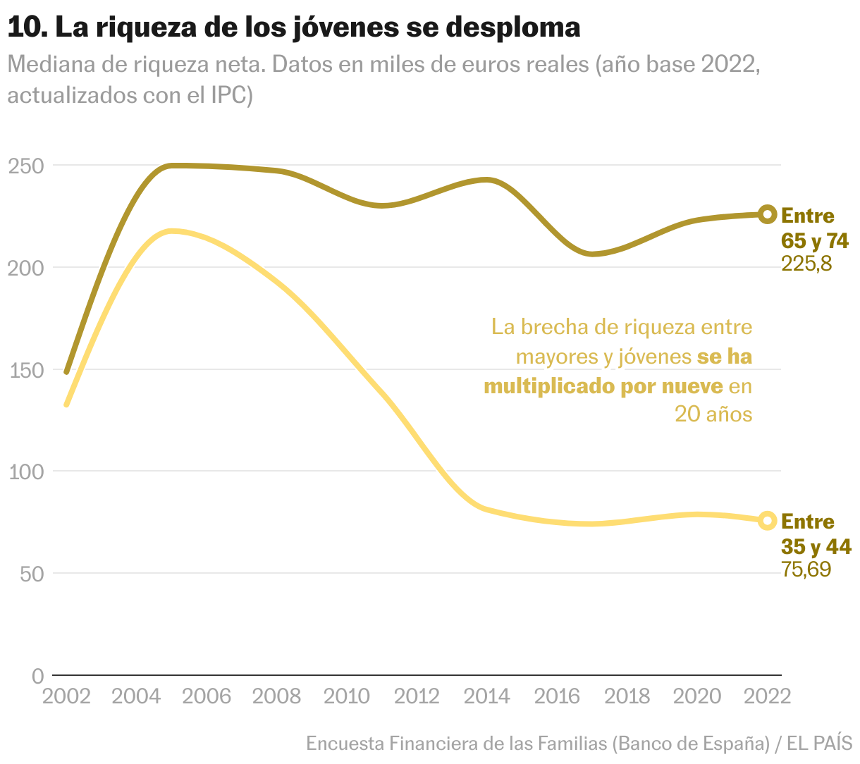 La última consecuencia tiene que ver con la riqueza. Hace veinte años, el patrimonio de los hogares de gente de 40 años y el de aquellos con 70 años era similar: tenían un capital —casi todo inmobiliario— de unos 150.000 euros de mediana. La mitad de los hogares tenían más que eso, y la mitad tenían menos. Luego vino la burbuja, una crisis económica y ahora la subida disparada de la vivienda. ¿Cómo es la brecha de riqueza ahora? Los hogares jóvenes son más pobres que hace dos décadas —tienen 75.000 euros de patrimonio— y los hogares de 70 años, con 225.000 euros, son más ricos.
