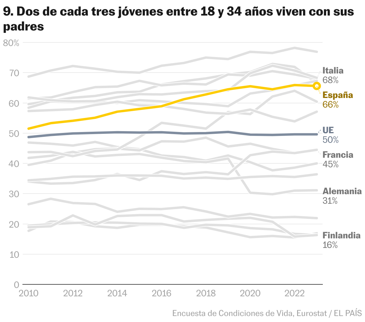 Otra consecuencia la mencionamos al principio: en España no ha parado de retrasarse la edad a la que los jóvenes se independizan de sus padres. El 66% de los jóvenes entre 18 y 34 años sigue aún en el hogar familiar, frente al 50% de 2010. España ya era uno de los países con emancipación tardía, pero ahora solo le superan Croacia, Eslovaquia, Portugal, Italia, Polonia y Grecia. El contraste es total frente a países como Francia (45%), Alemania(31%) o Finlandia, donde apenas 1 de cada 6 jóvenes vive con sus padres.