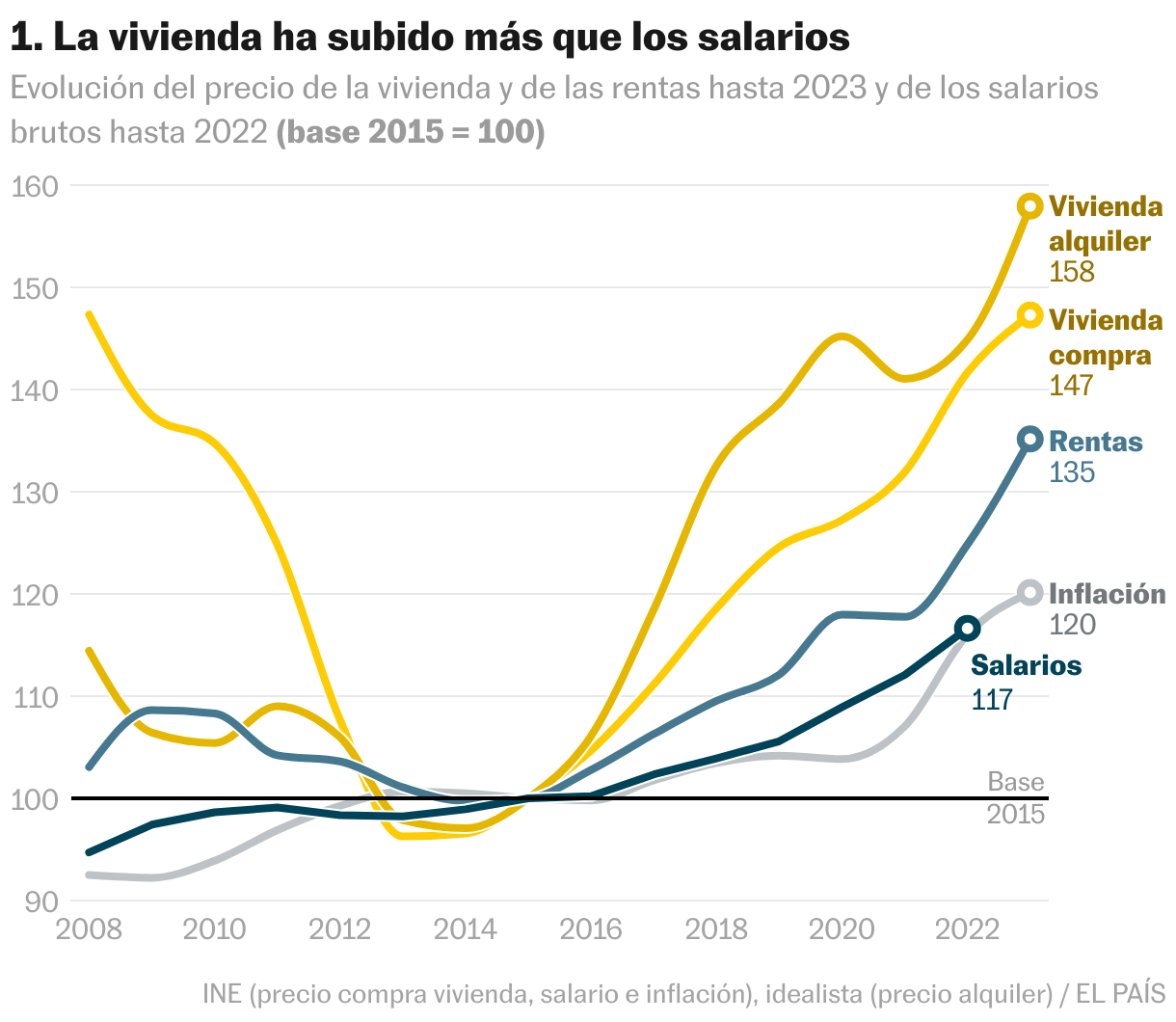 La situación se puede resumir mirando precios y rentas: entre 2015 y 2023, la compra de vivienda en España se encareció un 47% y el alquiler un 58%, mientras que los ingresos de los hogares crecieron menos. Las rentas subieron un 35%, empujadas por el descenso del paro y la revalorización de las pensiones. Los salarios de los trabajadores apenas aumentaron un 17% hasta 2022, casi tanto como la inflación.