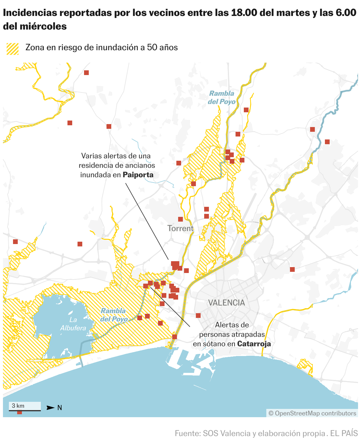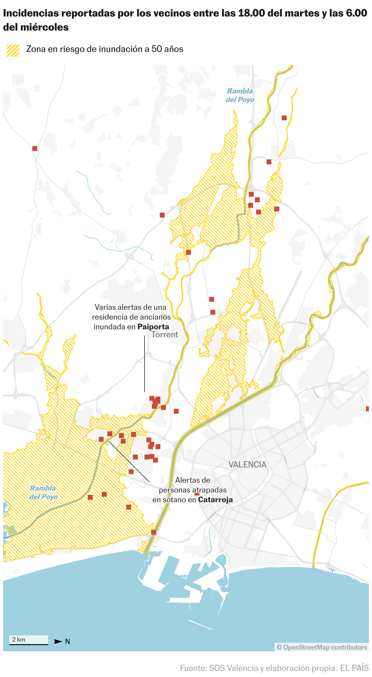 Los testimonios de personas que se vieron sorprendidas por trombas de agua se reparten por las comarcas más afectadas: Utiel-Requena, la Hoya de Buñol, l’Horta de Valencia y La Ribera. Las zonas más afectadas han comenzado a conocerse este miércoles, después de una noche de pesadilla. Decenas de personas han tenido que pasar la noche en Valencia en lo alto de camiones o coches, subidos a los techos de tiendas o gasolineras, o atrapados en sus vehículos en carreteras atascadas hasta que han sido rescatadas.